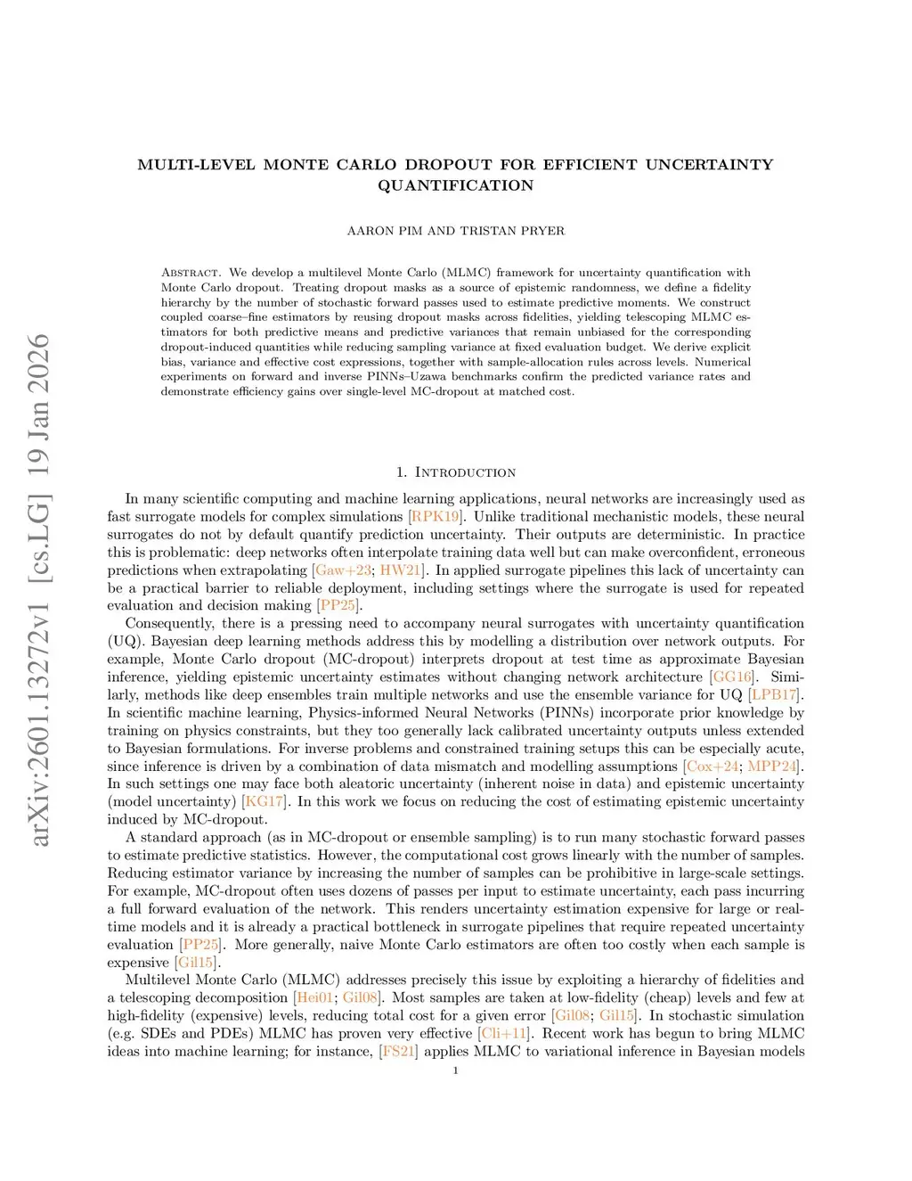 We develop a multilevel Monte Carlo (MLMC) framework for uncertainty quantification with Monte Carlo dropout. Treating dropout masks as a source of epistemic randomness, we define a fidelity hierarchy by the number of stochastic forward passes used to estimate predictive moments. We construct coupled coarse--fine estimators by reusing dropout masks across fidelities, yielding telescoping MLMC estimators for both predictive means and predictive variances that remain unbiased for the corresponding dropout-induced quantities while reducing sampling variance at fixed evaluation budget. We derive explicit bias, variance and effective cost expressions, together with sample-allocation rules across levels. Numerical experiments on forward and inverse PINNs--Uzawa benchmarks confirm the predicted variance rates and demonstrate efficiency gains over single-level MC-dropout at matched cost.