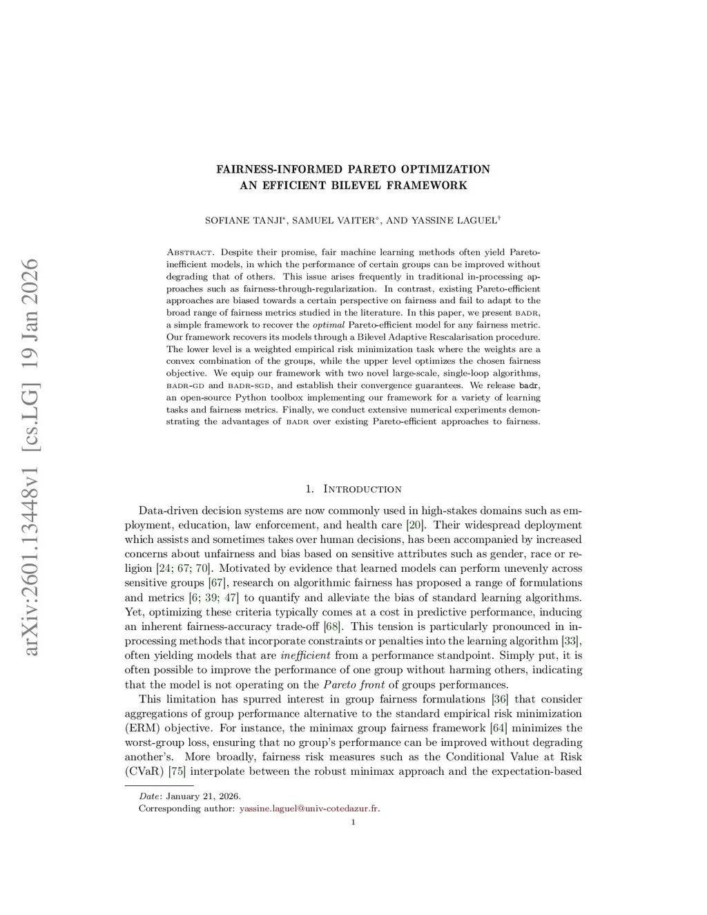 Fairness-informed Pareto Optimization : An Efficient Bilevel Framework
