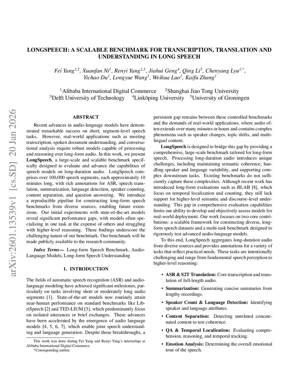LongSpeech: A Scalable Benchmark for Transcription, Translation and Understanding in Long Speech