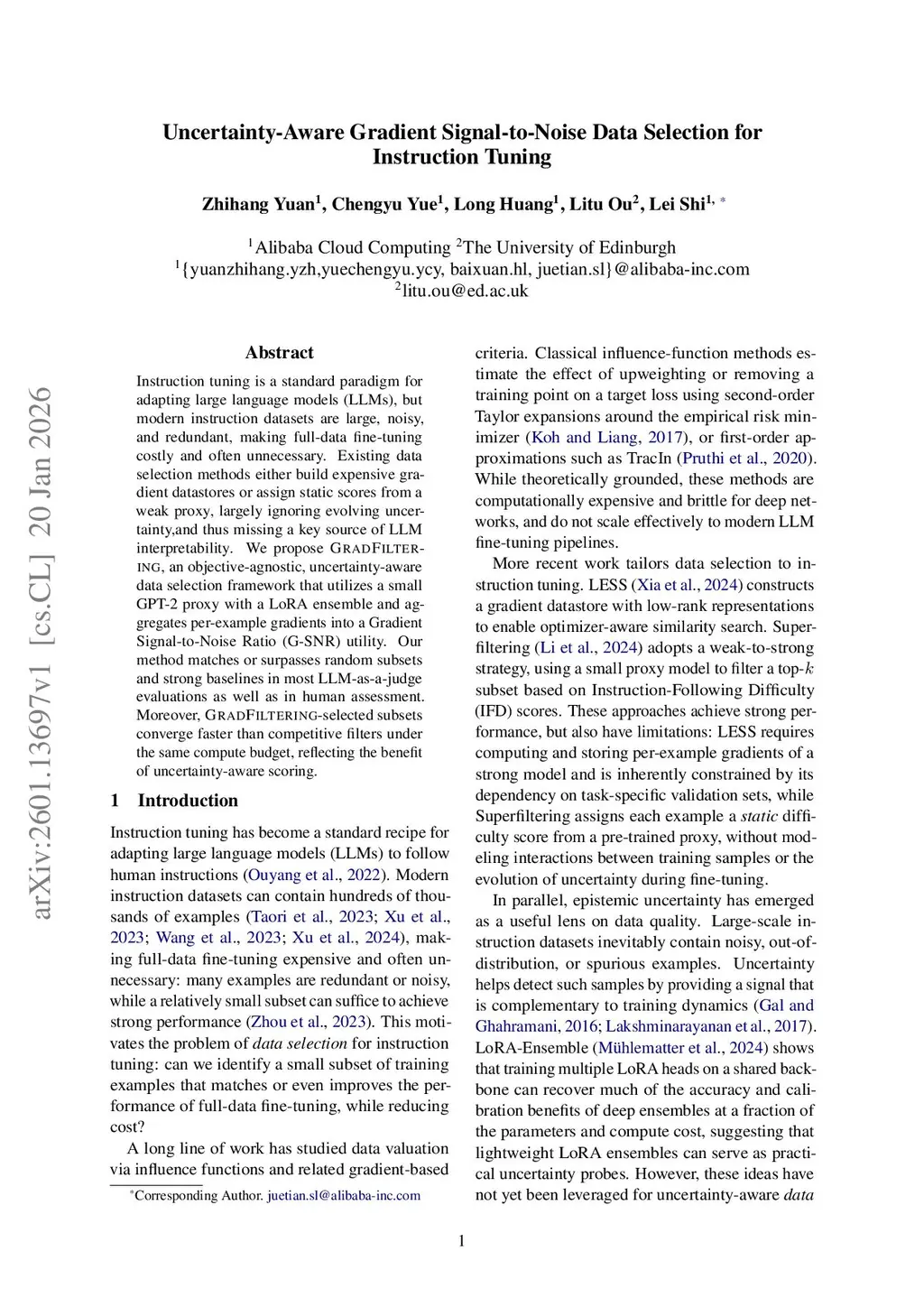 Instruction tuning is a standard paradigm for adapting large language models (LLMs), but modern instruction datasets are large, noisy, and redundant, making full-data fine-tuning costly and often unnecessary. Existing data selection methods either build expensive gradient datastores or assign static scores from a weak proxy, largely ignoring evolving uncertainty, and thus missing a key source of LLM interpretability. We propose GRADFILTERING, an objective-agnostic, uncertainty-aware data selection framework that utilizes a small GPT-2 proxy with a LoRA ensemble and aggregates per-example gradients into a Gradient Signal-to-Noise Ratio (G-SNR) utility. Our method matches or surpasses random subsets and strong baselines in most LLM-as-a-judge evaluations as well as in human assessment. Moreover, GRADFILTERING-selected subsets converge faster than competitive filters under the same compute budget, reflecting the benefit of uncertainty-aware scoring.