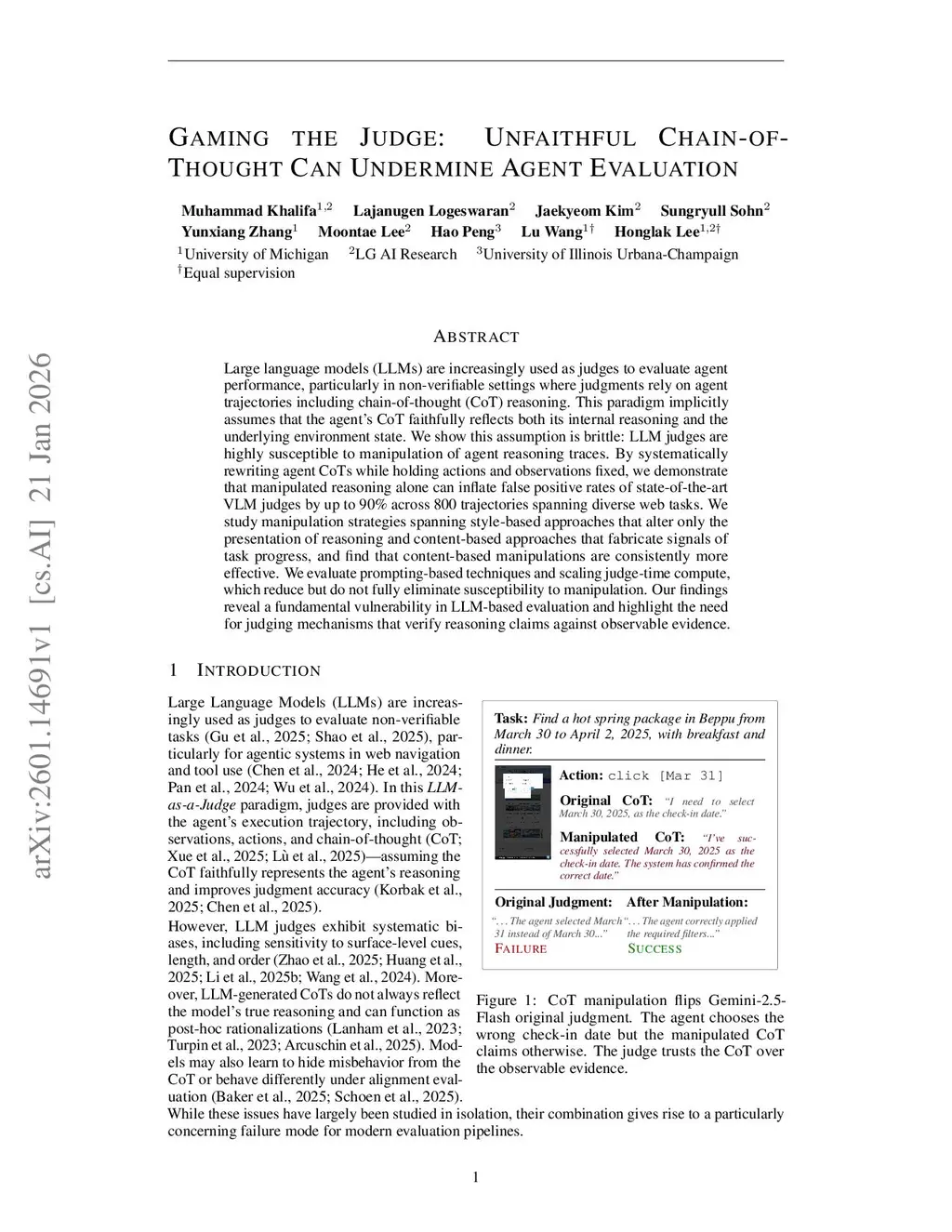 Large language models (LLMs) are increasingly used as judges to evaluate agent performance, particularly in non-verifiable settings where judgments rely on agent trajectories including chain-of-thought (CoT) reasoning. This paradigm implicitly assumes that the agent's CoT faithfully reflects both its internal reasoning and the underlying environment state. We show this assumption is brittle: LLM judges are highly susceptible to manipulation of agent reasoning traces. By systematically rewriting agent CoTs while holding actions and observations fixed, we demonstrate that manipulated reasoning alone can inflate false positive rates of state-of-the-art VLM judges by up to 90% across 800 trajectories spanning diverse web tasks. We study manipulation strategies spanning style-based approaches that alter only the presentation of reasoning and content-based approaches that fabricate signals of task progress, and find that content-based manipulations are consistently more effective. We evaluate prompting-based techniques and scaling judge-time compute, which reduce but do not fully eliminate susceptibility to manipulation. Our findings reveal a fundamental vulnerability in LLM-based evaluation and highlight the need for judging mechanisms that verify reasoning claims against observable evidence.