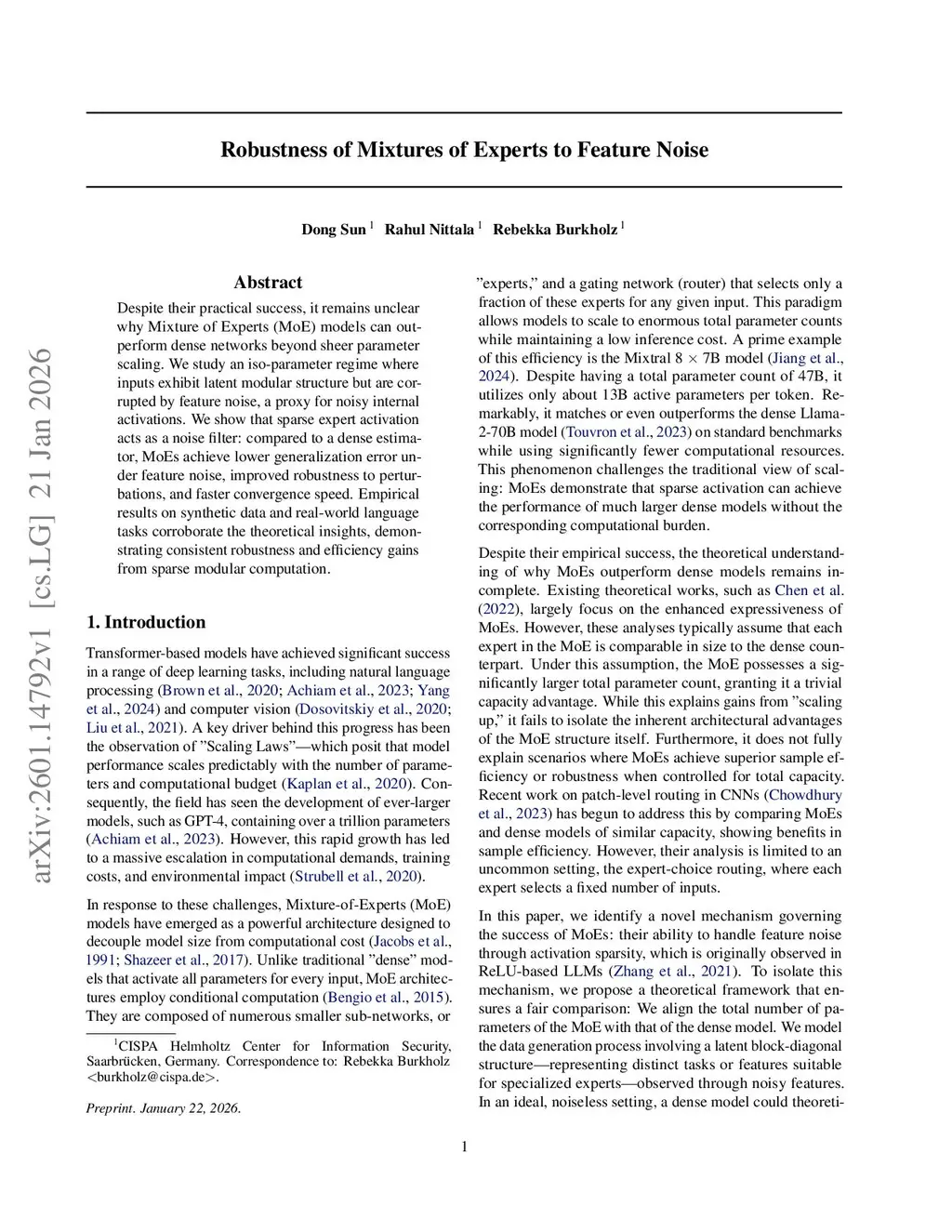 Despite their practical success, it remains unclear why Mixture of Experts (MoE) models can outperform dense networks beyond sheer parameter scaling. We study an iso-parameter regime where inputs exhibit latent modular structure but are corrupted by feature noise, a proxy for noisy internal activations. We show that sparse expert activation acts as a noise filter: compared to a dense estimator, MoEs achieve lower generalization error under feature noise, improved robustness to perturbations, and faster convergence speed. Empirical results on synthetic data and real-world language tasks corroborate the theoretical insights, demonstrating consistent robustness and efficiency gains from sparse modular computation.