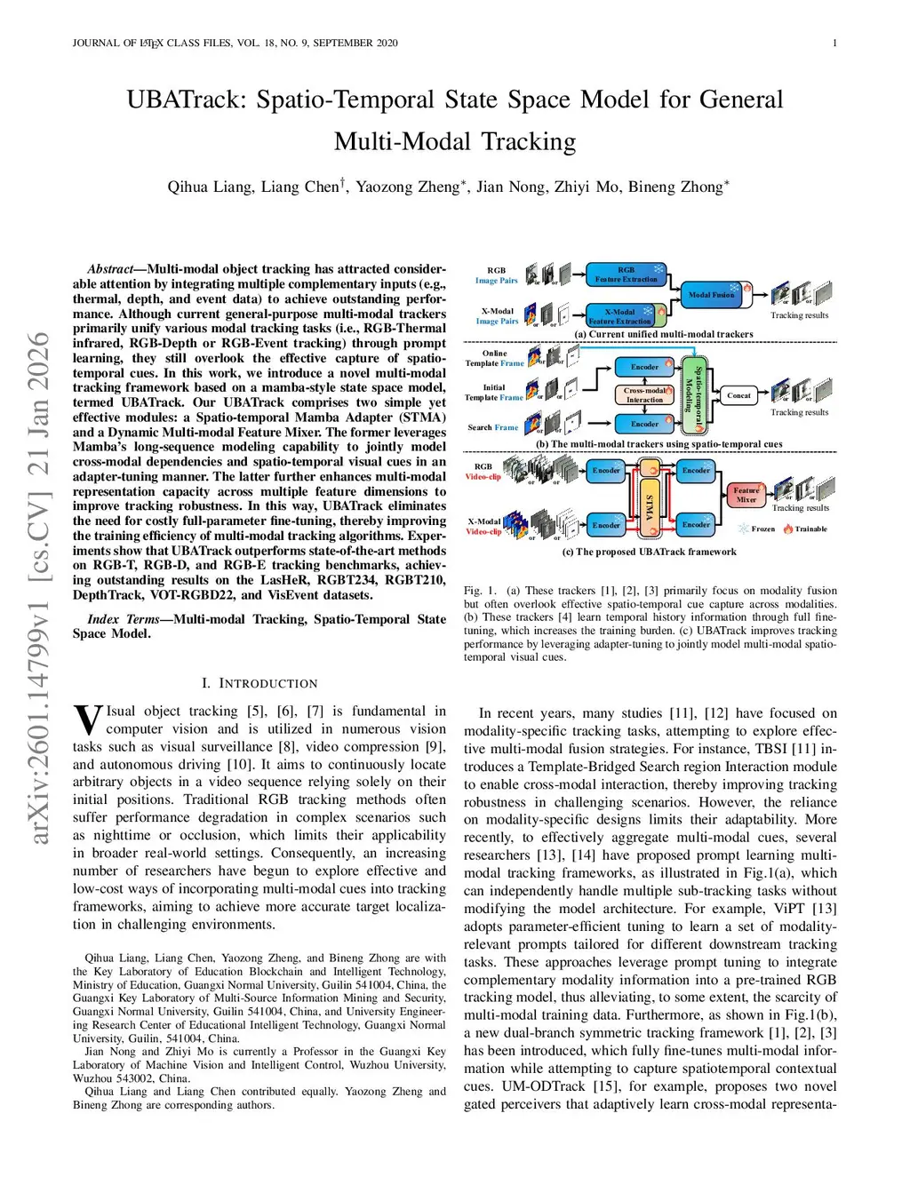 Multi-modal object tracking has attracted considerable attention by integrating multiple complementary inputs (e.g., thermal, depth, and event data) to achieve outstanding performance. Although current general-purpose multi-modal trackers primarily unify various modal tracking tasks (i.e., RGB-Thermal infrared, RGB-Depth or RGB-Event tracking) through prompt learning, they still overlook the effective capture of spatio-temporal cues. In this work, we introduce a novel multi-modal tracking framework based on a mamba-style state space model, termed UBATrack. Our UBATrack comprises two simple yet effective modules: a Spatio-temporal Mamba Adapter (STMA) and a Dynamic Multi-modal Feature Mixer. The former leverages Mamba's long-sequence modeling capability to jointly model cross-modal dependencies and spatio-temporal visual cues in an adapter-tuning manner. The latter further enhances multi-modal representation capacity across multiple feature dimensions to improve tracking robustness. In this way, UBATrack eliminates the need for costly full-parameter fine-tuning, thereby improving the training efficiency of multi-modal tracking algorithms. Experiments show that UBATrack outperforms state-of-the-art methods on RGB-T, RGB-D, and RGB-E tracking benchmarks, achieving outstanding results on the LasHeR, RGBT234, RGBT210, DepthTrack, VOT-RGBD22, and VisEvent datasets.
