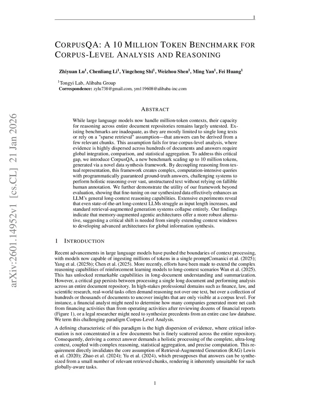 CorpusQA: A 10 Million Token Benchmark for Corpus-Level Analysis and Reasoning