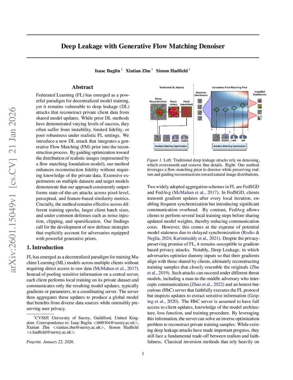 Federated Learning (FL) has emerged as a powerful paradigm for decentralized model training, yet it remains vulnerable to deep leakage (DL) attacks that reconstruct private client data from shared model updates. While prior DL methods have demonstrated varying levels of success, they often suffer from instability, limited fidelity, or poor robustness under realistic FL settings. We introduce a new DL attack that integrates a generative Flow Matching (FM) prior into the reconstruction process. By guiding optimization toward the distribution of realistic images (represented by a flow matching foundation model), our method enhances reconstruction fidelity without requiring knowledge of the private data. Extensive experiments on multiple datasets and target models demonstrate that our approach consistently outperforms state-of-the-art attacks across pixel-level, perceptual, and feature-based similarity metrics. Crucially, the method remains effective across different training epochs, larger client batch sizes, and under common defenses such as noise injection, clipping, and sparsification. Our findings call for the development of new defense strategies that explicitly account for adversaries equipped with powerful generative priors.