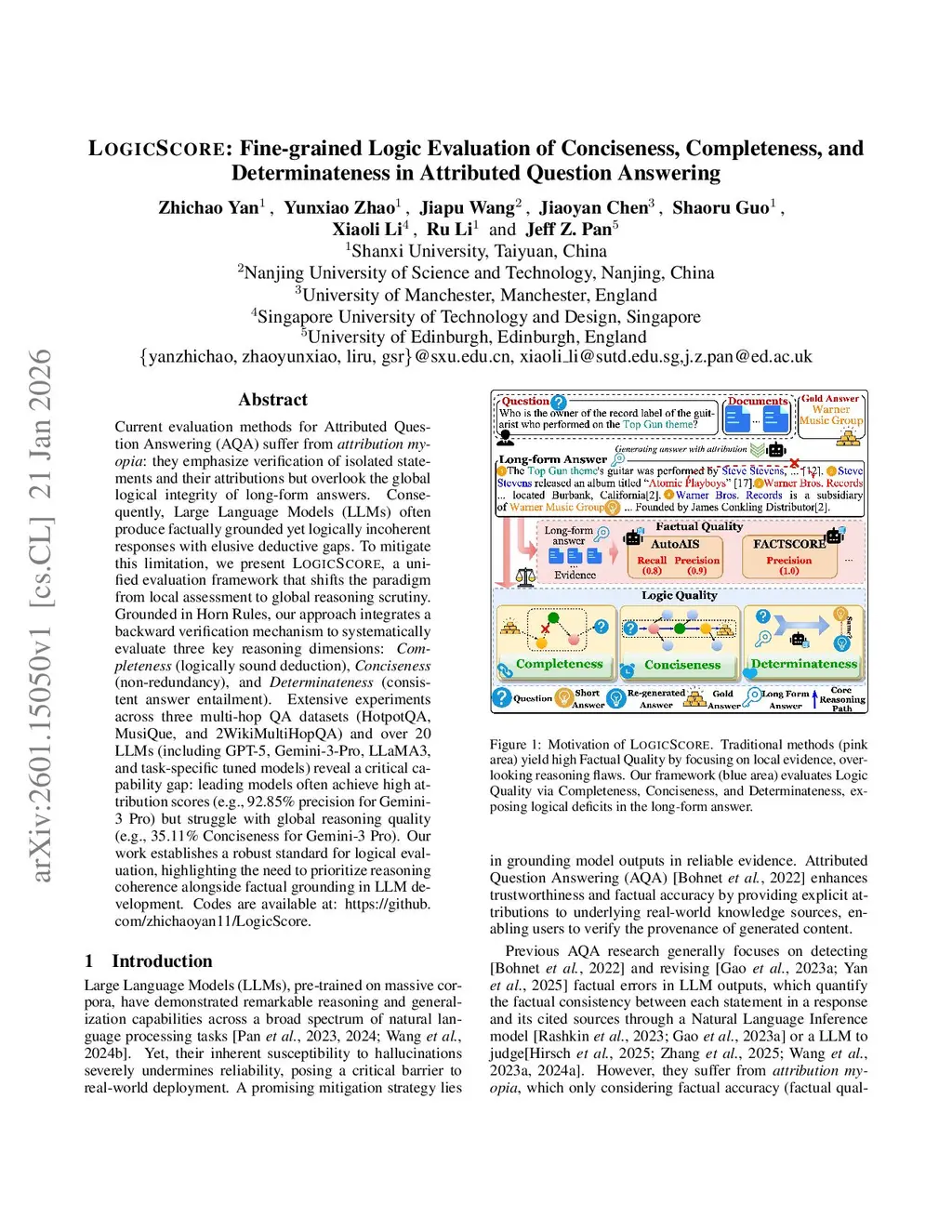 Current evaluation methods for Attributed Question Answering (AQA) suffer from \textit{attribution myopia}: they emphasize verification of isolated statements and their attributions but overlook the global logical integrity of long-form answers. Consequently, Large Language Models (LLMs) often produce factually grounded yet logically incoherent responses with elusive deductive gaps. To mitigate this limitation, we present \textsc{LogicScore}, a unified evaluation framework that shifts the paradigm from local assessment to global reasoning scrutiny. Grounded in Horn Rules, our approach integrates a backward verification mechanism to systematically evaluate three key reasoning dimensions: \textit{Completeness} (logically sound deduction), \textit{Conciseness} (non-redundancy), and \textit{Determinateness} (consistent answer entailment). Extensive experiments across three multi-hop QA datasets (HotpotQA, MusiQue, and 2WikiMultiHopQA) and over 20 LLMs (including GPT-5, Gemini-3-Pro, LLaMA3, and task-specific tuned models) reveal a critical capability gap: leading models often achieve high attribution scores (e.g., 92.85\% precision for Gemini-3 Pro) but struggle with global reasoning quality (e.g., 35.11\% Conciseness for Gemini-3 Pro). Our work establishes a robust standard for logical evaluation, highlighting the need to prioritize reasoning coherence alongside factual grounding in LLM development. Codes are available at:this https URL.