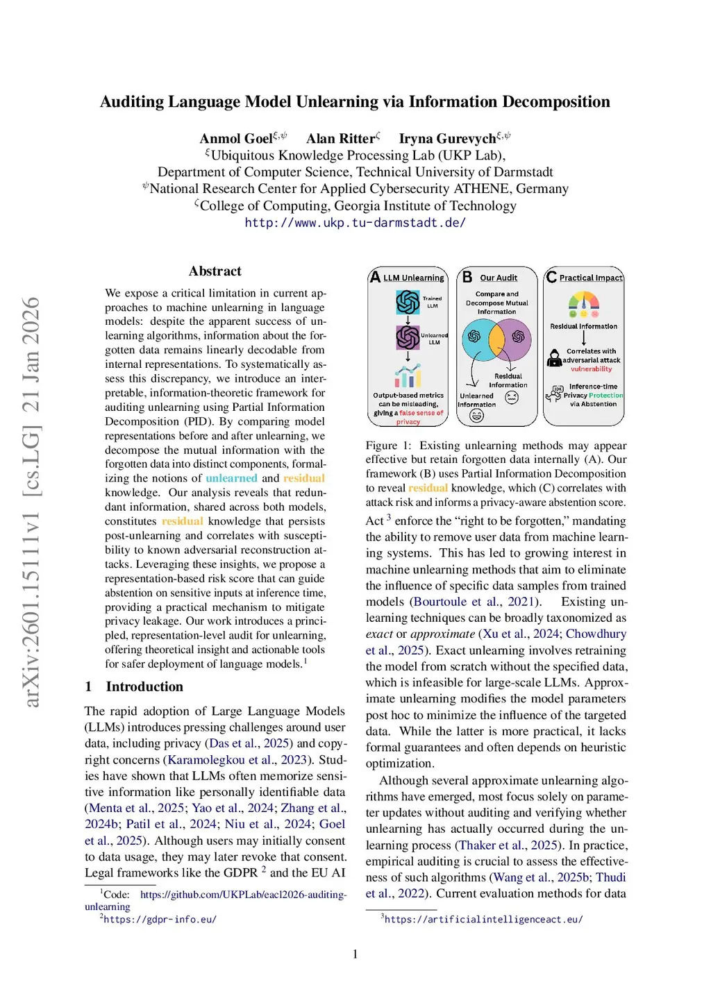 We expose a critical limitation in current approaches to machine unlearning in language models: despite the apparent success of unlearning algorithms, information about the forgotten data remains linearly decodable from internal representations. To systematically assess this discrepancy, we introduce an interpretable, information-theoretic framework for auditing unlearning using Partial Information Decomposition (PID). By comparing model representations before and after unlearning, we decompose the mutual information with the forgotten data into distinct components, formalizing the notions of unlearned and residual knowledge. Our analysis reveals that redundant information, shared across both models, constitutes residual knowledge that persists post-unlearning and correlates with susceptibility to known adversarial reconstruction attacks. Leveraging these insights, we propose a representation-based risk score that can guide abstention on sensitive inputs at inference time, providing a practical mechanism to mitigate privacy leakage. Our work introduces a principled, representation-level audit for unlearning, offering theoretical insight and actionable tools for safer deployment of language models.