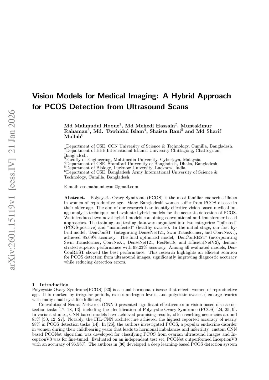 Polycystic Ovary Syndrome (PCOS) is the most familiar endocrine illness in women of reproductive age. Many Bangladeshi women suffer from PCOS disease in their older age. The aim of our research is to identify effective vision-based medical image analysis techniques and evaluate hybrid models for the accurate detection of PCOS. We introduced two novel hybrid models combining convolutional and transformer-based approaches. The training and testing data were organized into two categories: "infected" (PCOS-positive) and "noninfected" (healthy ovaries). In the initial stage, our first hybrid model, 'DenConST' (integrating DenseNet121, Swin Transformer, and ConvNeXt), achieved 85.69% accuracy. The final optimized model, 'DenConREST' (incorporating Swin Transformer, ConvNeXt, DenseNet121, ResNet18, and EfficientNetV2), demonstrated superior performance with 98.23% accuracy. Among all evaluated models, DenConREST showed the best performance. This research highlights an efficient solution for PCOS detection from ultrasound images, significantly improving diagnostic accuracy while reducing detection errors.