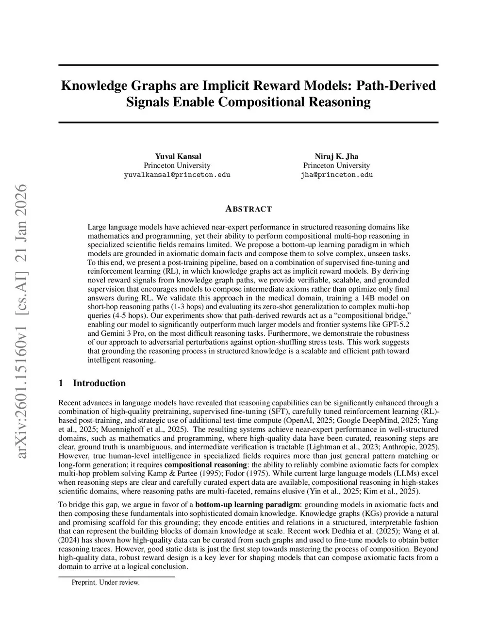 Large language models have achieved near-expert performance in structured reasoning domains like mathematics and programming, yet their ability to perform compositional multi-hop reasoning in specialized scientific fields remains limited. We propose a bottom-up learning paradigm in which models are grounded in axiomatic domain facts and compose them to solve complex, unseen tasks. To this end, we present a post-training pipeline, based on a combination of supervised fine-tuning and reinforcement learning (RL), in which knowledge graphs act as implicit reward models. By deriving novel reward signals from knowledge graph paths, we provide verifiable, scalable, and grounded supervision that encourages models to compose intermediate axioms rather than optimize only final answers during RL. We validate this approach in the medical domain, training a 14B model on short-hop reasoning paths (1-3 hops) and evaluating its zero-shot generalization to complex multi-hop queries (4-5 hops). Our experiments show that path-derived rewards act as a "compositional bridge", enabling our model to significantly outperform much larger models and frontier systems like GPT-5.2 and Gemini 3 Pro, on the most difficult reasoning tasks. Furthermore, we demonstrate the robustness of our approach to adversarial perturbations against option-shuffling stress tests. This work suggests that grounding the reasoning process in structured knowledge is a scalable and efficient path toward intelligent reasoning.