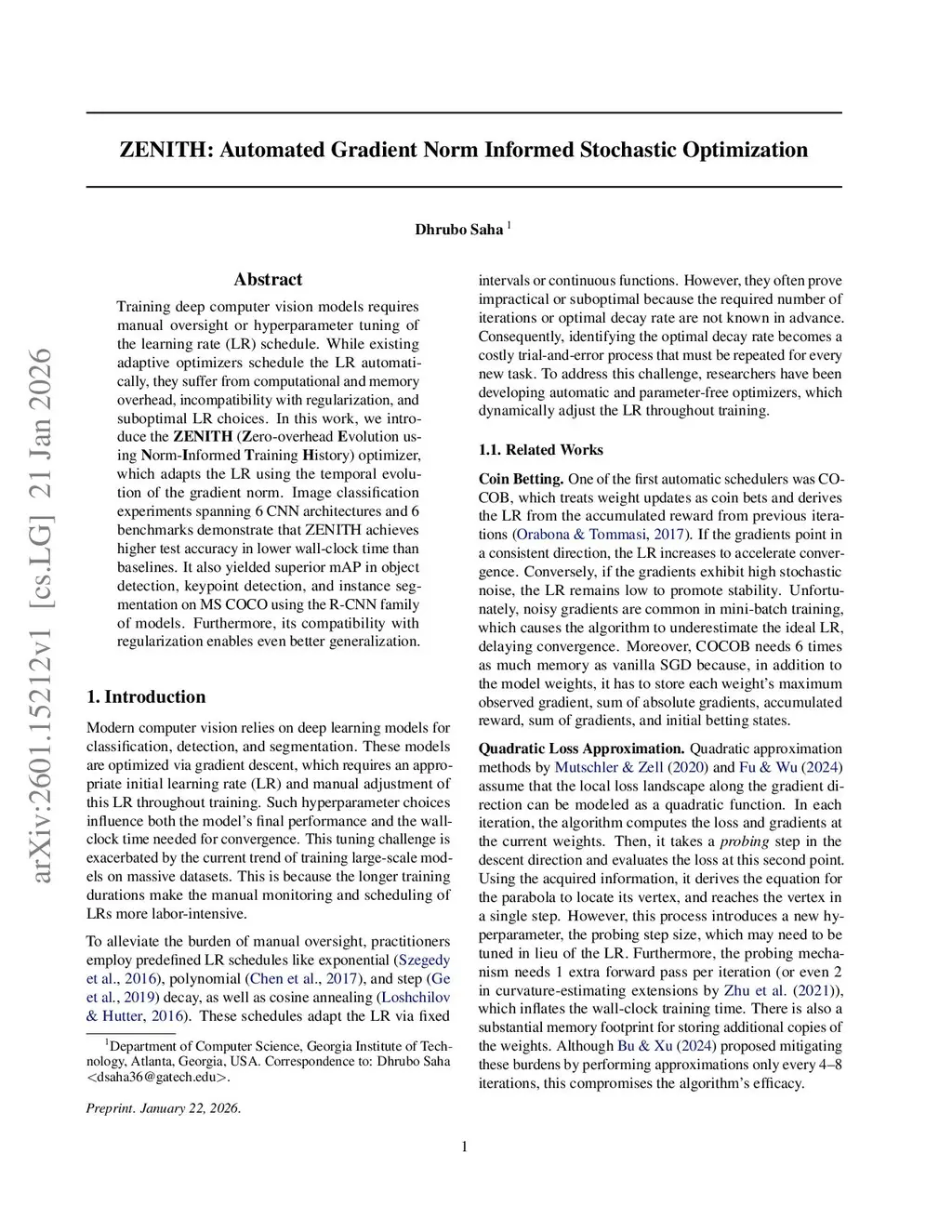 Training deep computer vision models requires manual oversight or hyperparameter tuning of the learning rate (LR) schedule. While existing adaptive optimizers schedule the LR automatically, they suffer from computational and memory overhead, incompatibility with regularization, and suboptimal LR choices. In this work, we introduce the ZENITH (Zero-overhead Evolution using Norm-Informed Training History) optimizer, which adapts the LR using the temporal evolution of the gradient norm. Image classification experiments spanning 6 CNN architectures and 6 benchmarks demonstrate that ZENITH achieves higher test accuracy in lower wall-clock time than baselines. It also yielded superior mAP in object detection, keypoint detection, and instance segmentation on MS COCO using the R-CNN family of models. Furthermore, its compatibility with regularization enables even better generalization.