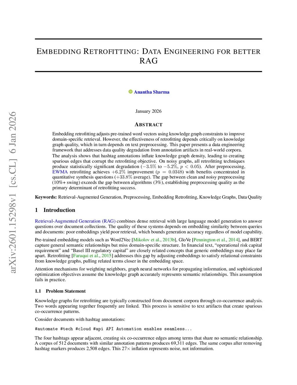 Embedding retrofitting adjusts pre-trained word vectors using knowledge graph constraints to improve domain-specific retrieval. However, the effectiveness of retrofitting depends critically on knowledge graph quality, which in turn depends on text preprocessing. This paper presents a data engineering framework that addresses data quality degradation from annotation artifacts in real-world corpora.The analysis shows that hashtag annotations inflate knowledge graph density, leading to creating spurious edges that corrupt the retrofitting objective. On noisy graphs, all retrofitting techniques produce statistically significant degradation ( to , ). After preprocessing, \acrshort{ewma} retrofitting achieves improvement () with benefits concentrated in quantitative synthesis questions ( average). The gap between clean and noisy preprocessing (10\%+ swing) exceeds the gap between algorithms (3\%), establishing preprocessing quality as the primary determinant of retrofitting success.