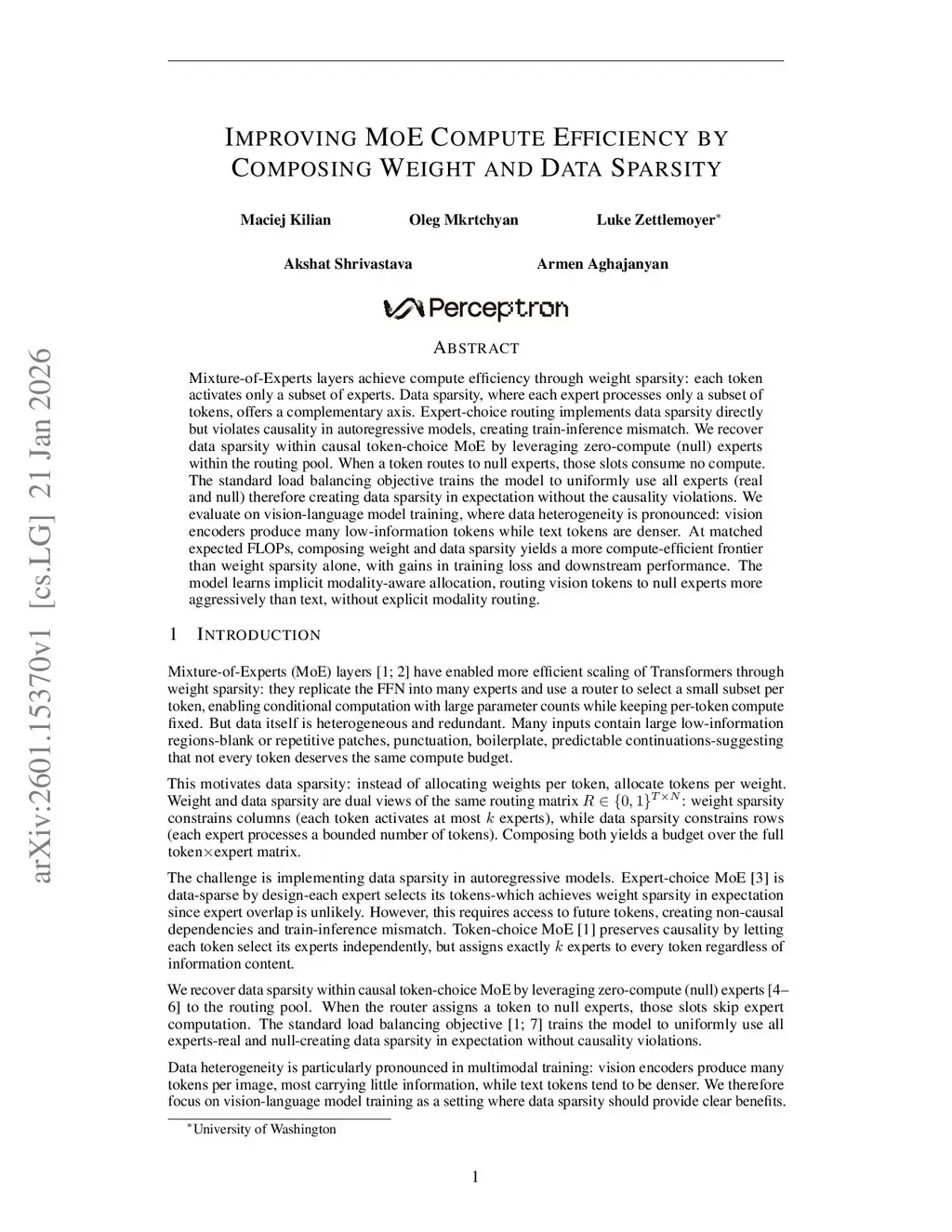 Mixture-of-Experts layers achieve compute efficiency through weight sparsity: each token activates only a subset of experts. Data sparsity, where each expert processes only a subset of tokens, offers a complementary axis. Expert-choice routing implements data sparsity directly but violates causality in autoregressive models, creating train-inference mismatch. We recover data sparsity within causal token-choice MoE by leveraging zero-compute (null) experts within the routing pool. When a token routes to null experts, those slots consume no compute. The standard load balancing objective trains the model to uniformly use all experts (real and null) therefore creating data sparsity in expectation without the causality violations. We evaluate on vision-language model training, where data heterogeneity is pronounced: vision encoders produce many low-information tokens while text tokens are denser. At matched expected FLOPs, composing weight and data sparsity yields a more compute-efficient frontier than weight sparsity alone, with gains in training loss and downstream performance. The model learns implicit modality-aware allocation, routing vision tokens to null experts more aggressively than text, without explicit modality routing.