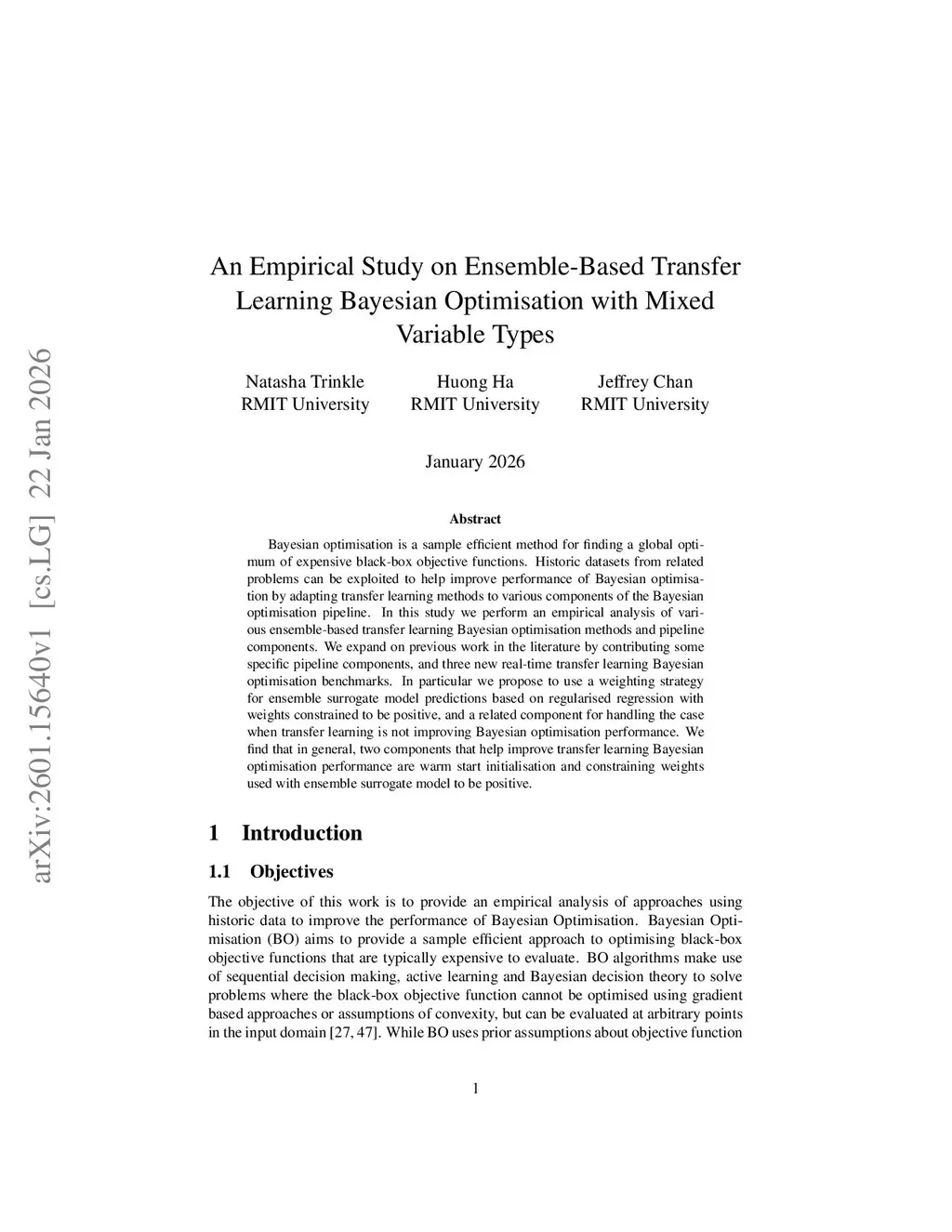 Bayesian optimisation is a sample efficient method for finding a global optimum of expensive black-box objective functions. Historic datasets from related problems can be exploited to help improve performance of Bayesian optimisation by adapting transfer learning methods to various components of the Bayesian optimisation pipeline. In this study we perform an empirical analysis of various ensemble-based transfer learning Bayesian optimisation methods and pipeline components. We expand on previous work in the literature by contributing some specific pipeline components, and three new real-time transfer learning Bayesian optimisation benchmarks. In particular we propose to use a weighting strategy for ensemble surrogate model predictions based on regularised regression with weights constrained to be positive, and a related component for handling the case when transfer learning is not improving Bayesian optimisation performance. We find that in general, two components that help improve transfer learning Bayesian optimisation performance are warm start initialisation and constraining weights used with ensemble surrogate model to be positive.