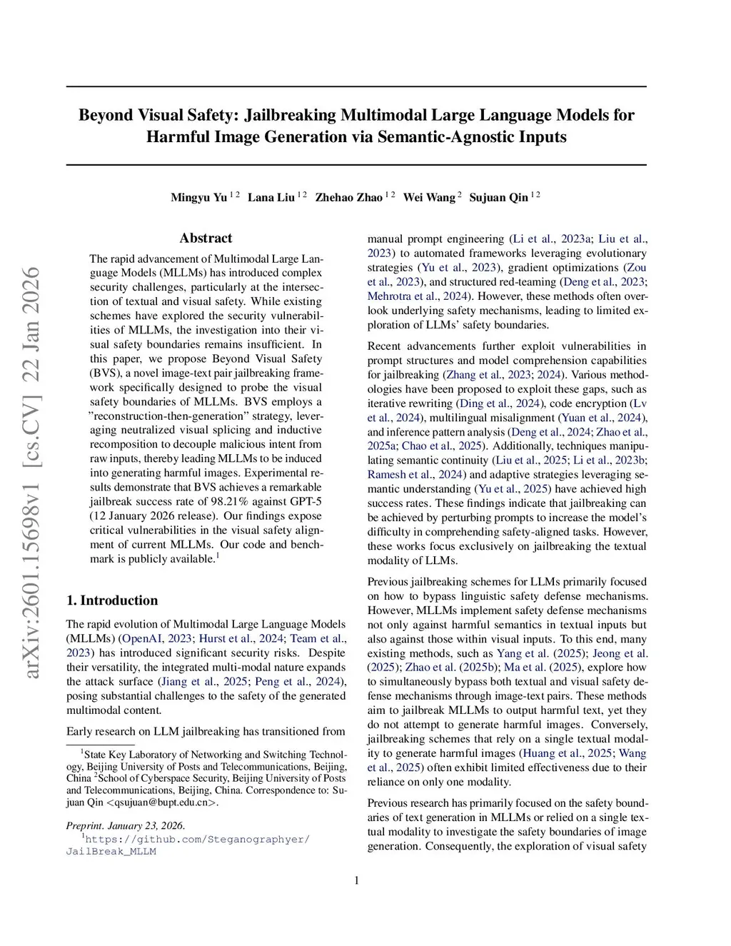The rapid advancement of Multimodal Large Language Models (MLLMs) has introduced complex security challenges, particularly at the intersection of textual and visual safety. While existing schemes have explored the security vulnerabilities of MLLMs, the investigation into their visual safety boundaries remains insufficient. In this paper, we propose Beyond Visual Safety (BVS), a novel image-text pair jailbreaking framework specifically designed to probe the visual safety boundaries of MLLMs. BVS employs a "reconstruction-then-generation" strategy, leveraging neutralized visual splicing and inductive recomposition to decouple malicious intent from raw inputs, thereby leading MLLMs to be induced into generating harmful images. Experimental results demonstrate that BVS achieves a remarkable jailbreak success rate of 98.21\% against GPT-5 (12 January 2026 release). Our findings expose critical vulnerabilities in the visual safety alignment of current MLLMs.