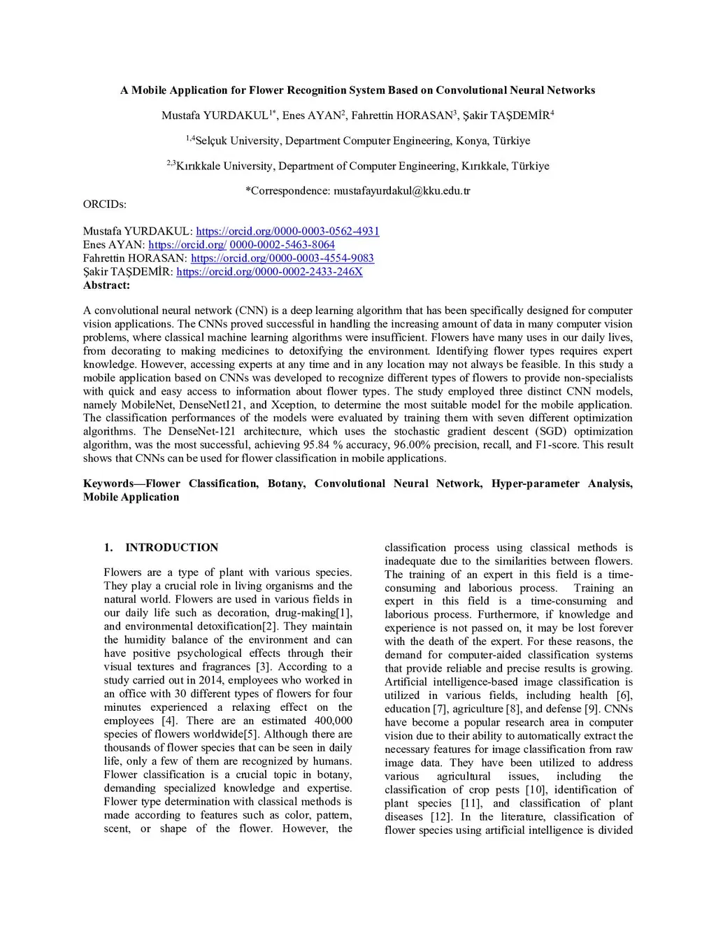 A convolutional neural network (CNN) is a deep learning algorithm that has been specifically designed for computer vision applications. The CNNs proved successful in handling the increasing amount of data in many computer vision problems, where classical machine learning algorithms were insufficient. Flowers have many uses in our daily lives, from decorating to making medicines to detoxifying the environment. Identifying flower types requires expert knowledge. However, accessing experts at any time and in any location may not always be feasible. In this study a mobile application based on CNNs was developed to recognize different types of flowers to provide non-specialists with quick and easy access to information about flower types. The study employed three distinct CNN models, namely MobileNet, DenseNet121, and Xception, to determine the most suitable model for the mobile application. The classification performances of the models were evaluated by training them with seven different optimization algorithms. The DenseNet-121 architecture, which uses the stochastic gradient descent (SGD) optimization algorithm, was the most successful, achieving 95.84 % accuracy, 96.00% precision, recall, and F1-score. This result shows that CNNs can be used for flower classification in mobile applications.