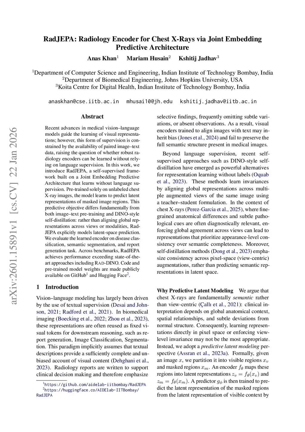 RadJEPA: Radiology Encoder for Chest X-Rays via Joint Embedding Predictive Architecture