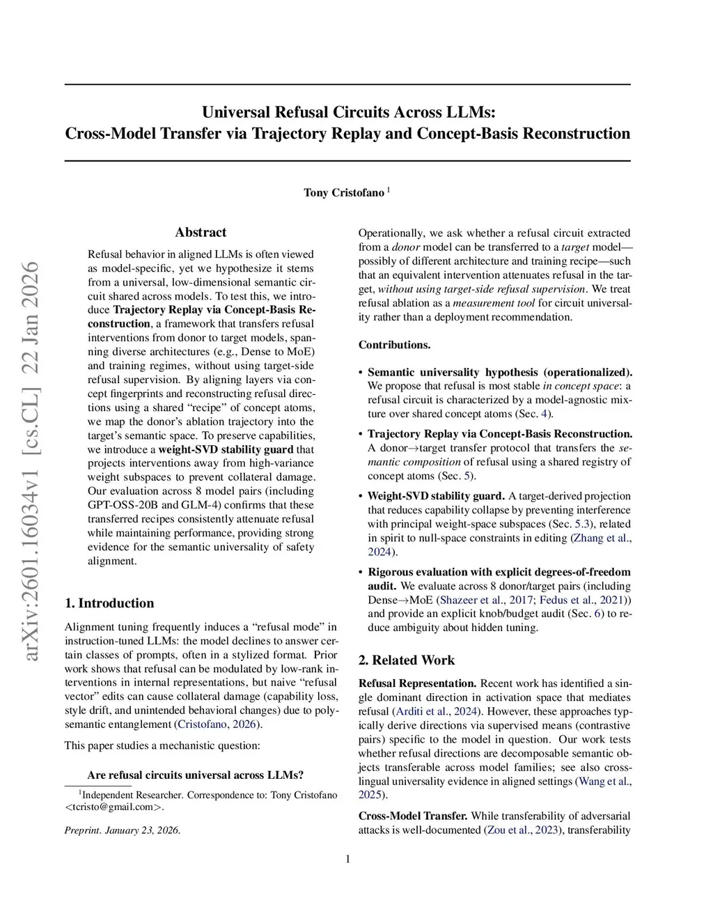 Refusal behavior in aligned LLMs is often viewed as model-specific, yet we hypothesize it stems from a universal, low-dimensional semantic circuit shared across models. To test this, we introduce Trajectory Replay via Concept-Basis Reconstruction, a framework that transfers refusal interventions from donor to target models, spanning diverse architectures (e.g., Dense to MoE) and training regimes, without using target-side refusal supervision. By aligning layers via concept fingerprints and reconstructing refusal directions using a shared ``recipe'' of concept atoms, we map the donor's ablation trajectory into the target's semantic space. To preserve capabilities, we introduce a weight-SVD stability guard that projects interventions away from high-variance weight subspaces to prevent collateral damage. Our evaluation across 8 model pairs confirms that these transferred recipes consistently attenuate refusal while maintaining performance, providing strong evidence for the semantic universality of safety alignment.