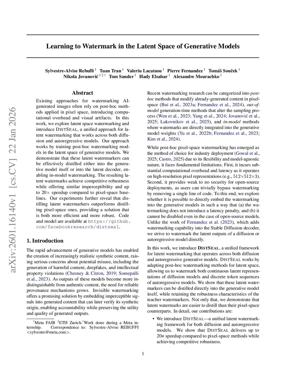 Existing approaches for watermarking AI-generated images often rely on post-hoc methods applied in pixel space, introducing computational overhead and potential visual artifacts. In this work, we explore latent space watermarking and introduce DistSeal, a unified approach for latent watermarking that works across both diffusion and autoregressive models. Our approach works by training post-hoc watermarking models in the latent space of generative models. We demonstrate that these latent watermarkers can be effectively distilled either into the generative model itself or into the latent decoder, enabling in-model watermarking. The resulting latent watermarks achieve competitive robustness while offering similar imperceptibility and up to 20x speedup compared to pixel-space baselines. Our experiments further reveal that distilling latent watermarkers outperforms distilling pixel-space ones, providing a solution that is both more efficient and more robust.