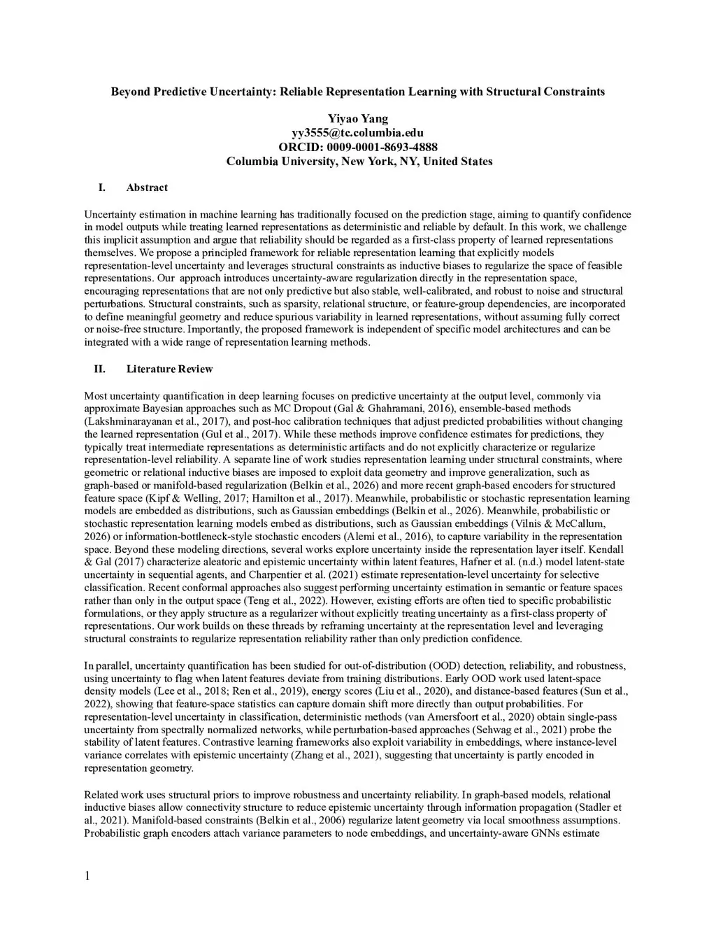 Uncertainty estimation in machine learning has traditionally focused on the prediction stage, aiming to quantify confidence in model outputs while treating learned representations as deterministic and reliable by default. In this work, we challenge this implicit assumption and argue that reliability should be regarded as a first-class property of learned representations themselves. We propose a principled framework for reliable representation learning that explicitly models representation-level uncertainty and leverages structural constraints as inductive biases to regularize the space of feasible representations. Our approach introduces uncertainty-aware regularization directly in the representation space, encouraging representations that are not only predictive but also stable, well-calibrated, and robust to noise and structural perturbations. Structural constraints, such as sparsity, relational structure, or feature-group dependencies, are incorporated to define meaningful geometry and reduce spurious variability in learned representations, without assuming fully correct or noise-free structure. Importantly, the proposed framework is independent of specific model architectures and can be integrated with a wide range of representation learning methods.