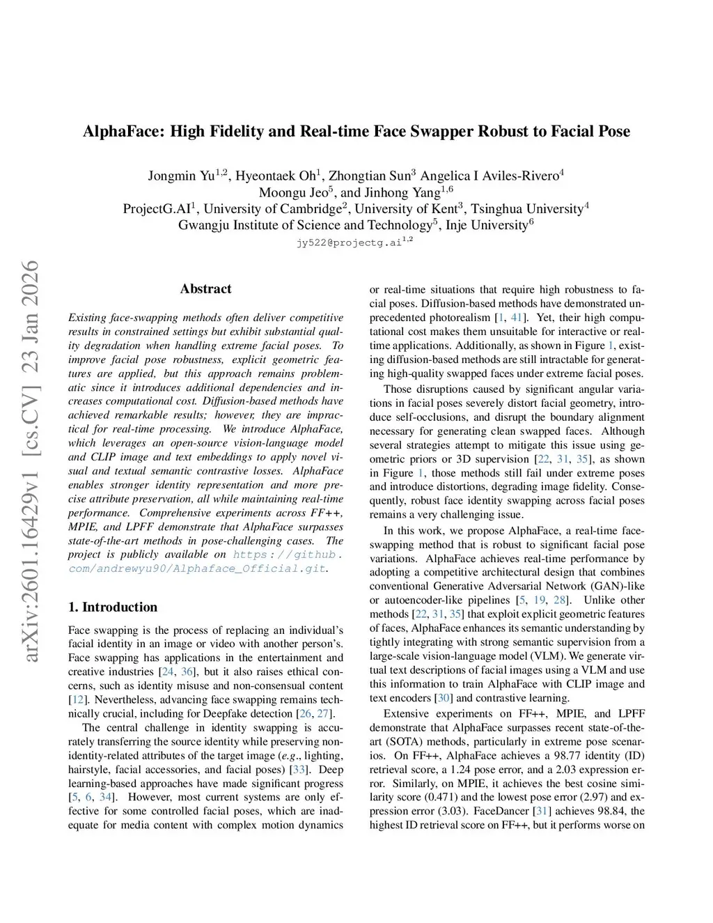 Existing face-swapping methods often deliver competitive results in constrained settings but exhibit substantial quality degradation when handling extreme facial poses. To improve facial pose robustness, explicit geometric features are applied, but this approach remains problematic since it introduces additional dependencies and increases computational cost. Diffusion-based methods have achieved remarkable results; however, they are impractical for real-time processing. We introduce AlphaFace, which leverages an open-source vision-language model and CLIP image and text embeddings to apply novel visual and textual semantic contrastive losses. AlphaFace enables stronger identity representation and more precise attribute preservation, all while maintaining real-time performance. Comprehensive experiments across FF++, MPIE, and LPFF demonstrate that AlphaFace surpasses state-of-the-art methods in pose-challenging cases. The project is publicly available on `this https URL.