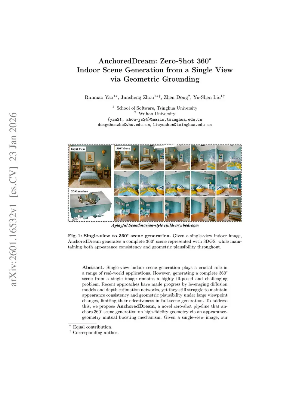 Single-view indoor scene generation plays a crucial role in a range of real-world applications. However, generating a complete 360° scene from a single image remains a highly ill-posed and challenging problem. Recent approaches have made progress by leveraging diffusion models and depth estimation networks, yet they still struggle to maintain appearance consistency and geometric plausibility under large viewpoint changes, limiting their effectiveness in full-scene generation. To address this, we propose AnchoredDream, a novel zero-shot pipeline that anchors 360° scene generation on high-fidelity geometry via an appearance-geometry mutual boosting mechanism. Given a single-view image, our method first performs appearance-guided geometry generation to construct a reliable 3D scene layout. Then, we progressively generate the complete scene through a series of modules: warp-and-inpaint, warp-and-refine, post-optimization, and a novel Grouting Block, which ensures seamless transitions between the input view and generated regions. Extensive experiments demonstrate that AnchoredDream outperforms existing methods by a large margin in both appearance consistency and geometric plausibility--all in a zero-shot manner. Our results highlight the potential of geometric grounding for high-quality, zero-shot single-view scene generation.