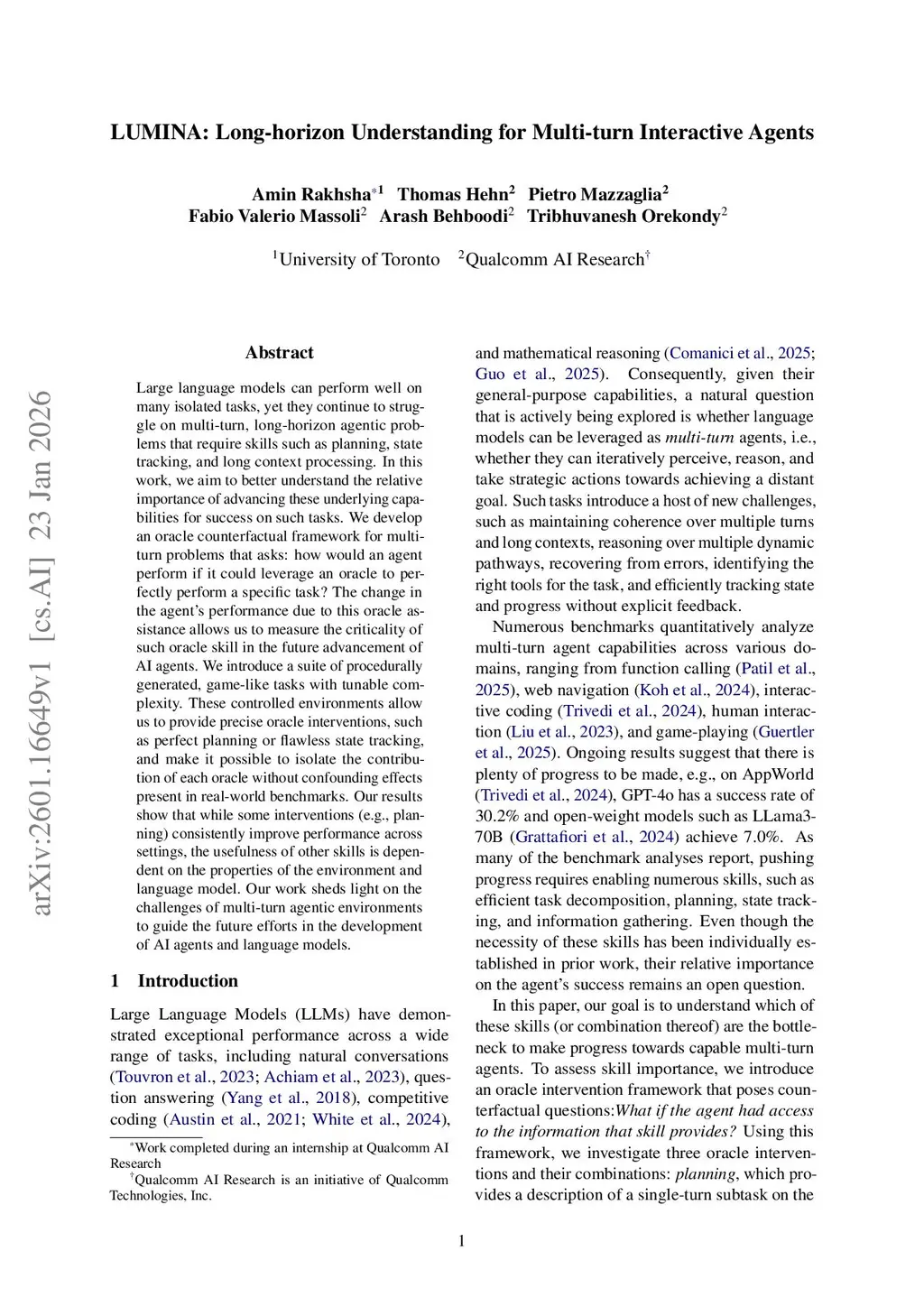 Large language models can perform well on many isolated tasks, yet they continue to struggle on multi-turn, long-horizon agentic problems that require skills such as planning, state tracking, and long context processing. In this work, we aim to better understand the relative importance of advancing these underlying capabilities for success on such tasks. We develop an oracle counterfactual framework for multi-turn problems that asks: how would an agent perform if it could leverage an oracle to perfectly perform a specific task? The change in the agent's performance due to this oracle assistance allows us to measure the criticality of such oracle skill in the future advancement of AI agents. We introduce a suite of procedurally generated, game-like tasks with tunable complexity. These controlled environments allow us to provide precise oracle interventions, such as perfect planning or flawless state tracking, and make it possible to isolate the contribution of each oracle without confounding effects present in real-world benchmarks. Our results show that while some interventions (e.g., planning) consistently improve performance across settings, the usefulness of other skills is dependent on the properties of the environment and language model. Our work sheds light on the challenges of multi-turn agentic environments to guide the future efforts in the development of AI agents and language models.