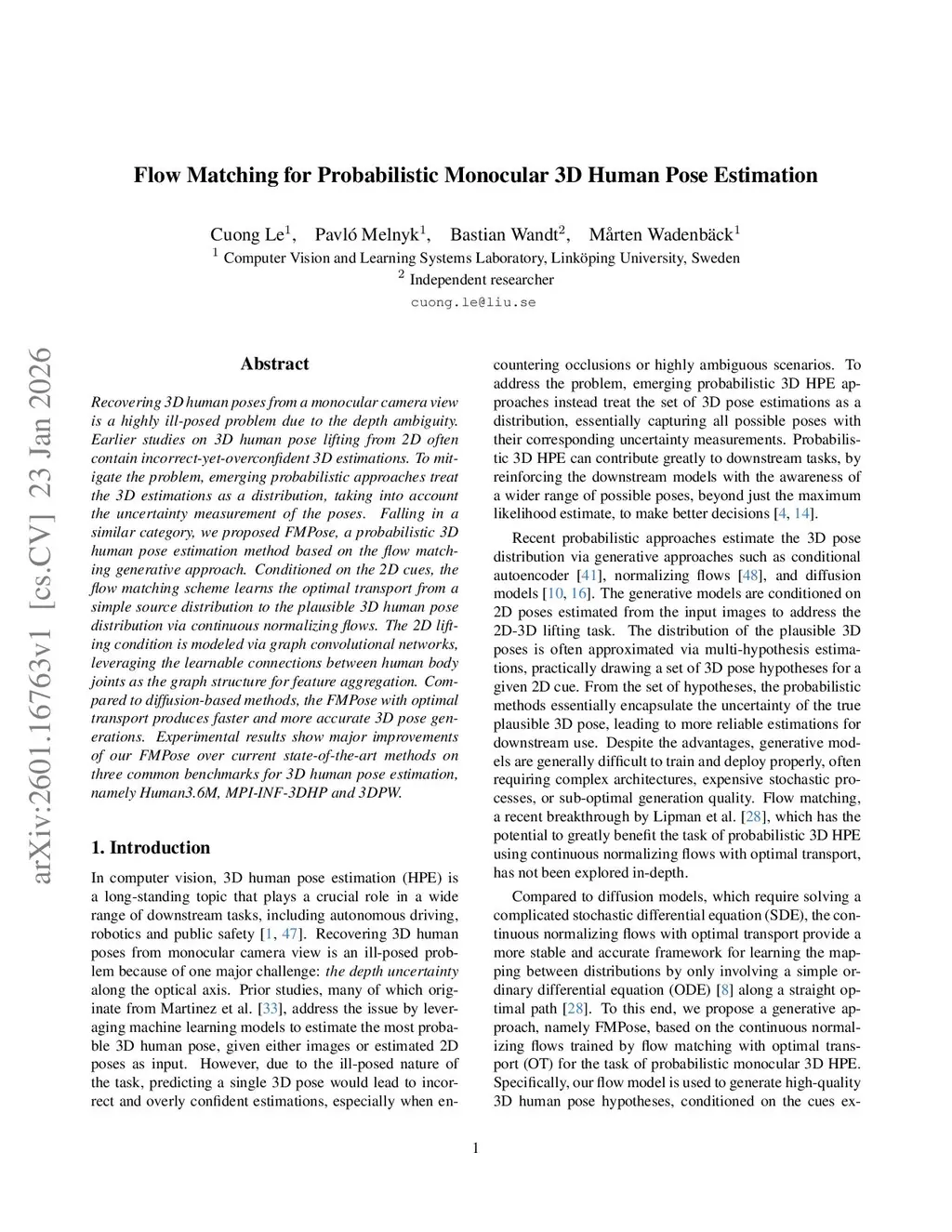Recovering 3D human poses from a monocular camera view is a highly ill-posed problem due to the depth ambiguity. Earlier studies on 3D human pose lifting from 2D often contain incorrect-yet-overconfident 3D estimations. To mitigate the problem, emerging probabilistic approaches treat the 3D estimations as a distribution, taking into account the uncertainty measurement of the poses. Falling in a similar category, we proposed FMPose, a probabilistic 3D human pose estimation method based on the flow matching generative approach. Conditioned on the 2D cues, the flow matching scheme learns the optimal transport from a simple source distribution to the plausible 3D human pose distribution via continuous normalizing flows. The 2D lifting condition is modeled via graph convolutional networks, leveraging the learnable connections between human body joints as the graph structure for feature aggregation. Compared to diffusion-based methods, the FMPose with optimal transport produces faster and more accurate 3D pose generations. Experimental results show major improvements of our FMPose over current state-of-the-art methods on three common benchmarks for 3D human pose estimation, namely Human3.6M, MPI-INF-3DHP and 3DPW.