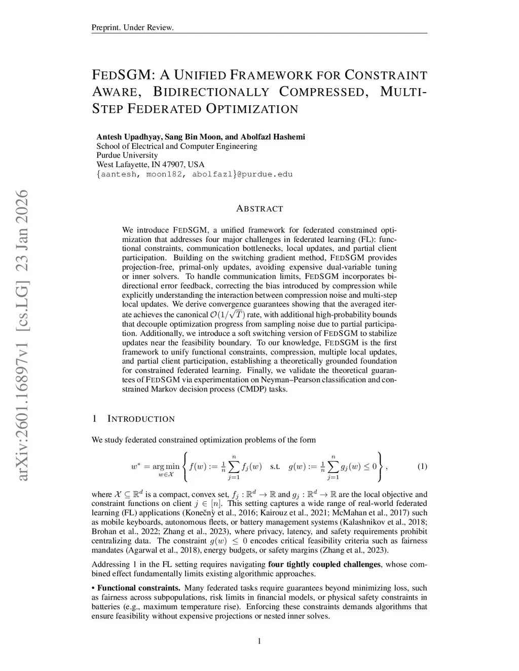 We introduce FedSGM, a unified framework for federated constrained optimization that addresses four major challenges in federated learning (FL): functional constraints, communication bottlenecks, local updates, and partial client participation. Building on the switching gradient method, FedSGM provides projection-free, primal-only updates, avoiding expensive dual-variable tuning or inner solvers. To handle communication limits, FedSGM incorporates bi-directional error feedback, correcting the bias introduced by compression while explicitly understanding the interaction between compression noise and multi-step local updates. We derive convergence guarantees showing that the averaged iterate achieves the canonical rate, with additional high-probability bounds that decouple optimization progress from sampling noise due to partial participation. Additionally, we introduce a soft switching version of FedSGM to stabilize updates near the feasibility boundary. To our knowledge, FedSGM is the first framework to unify functional constraints, compression, multiple local updates, and partial client participation, establishing a theoretically grounded foundation for constrained federated learning. Finally, we validate the theoretical guarantees of FedSGM via experimentation on Neyman-Pearson classification and constrained Markov decision process (CMDP) tasks.