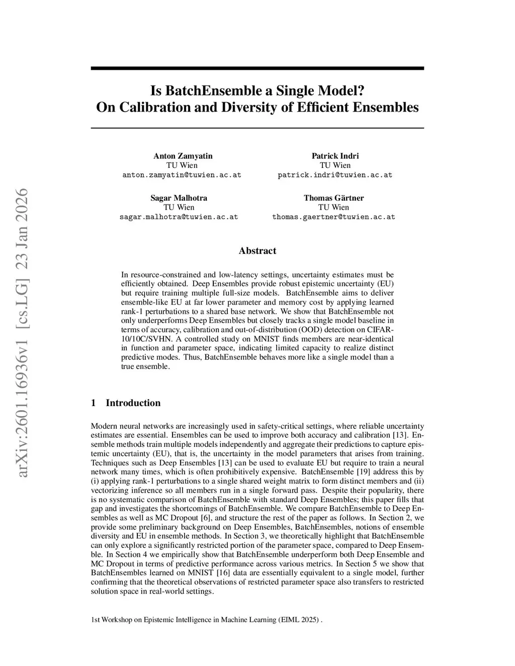 In resource-constrained and low-latency settings, uncertainty estimates must be efficiently obtained. Deep Ensembles provide robust epistemic uncertainty (EU) but require training multiple full-size models. BatchEnsemble aims to deliver ensemble-like EU at far lower parameter and memory cost by applying learned rank-1 perturbations to a shared base network. We show that BatchEnsemble not only underperforms Deep Ensembles but closely tracks a single model baseline in terms of accuracy, calibration and out-of-distribution (OOD) detection on CIFAR10/10C/SVHN. A controlled study on MNIST finds members are near-identical in function and parameter space, indicating limited capacity to realize distinct predictive modes. Thus, BatchEnsemble behaves more like a single model than a true ensemble.