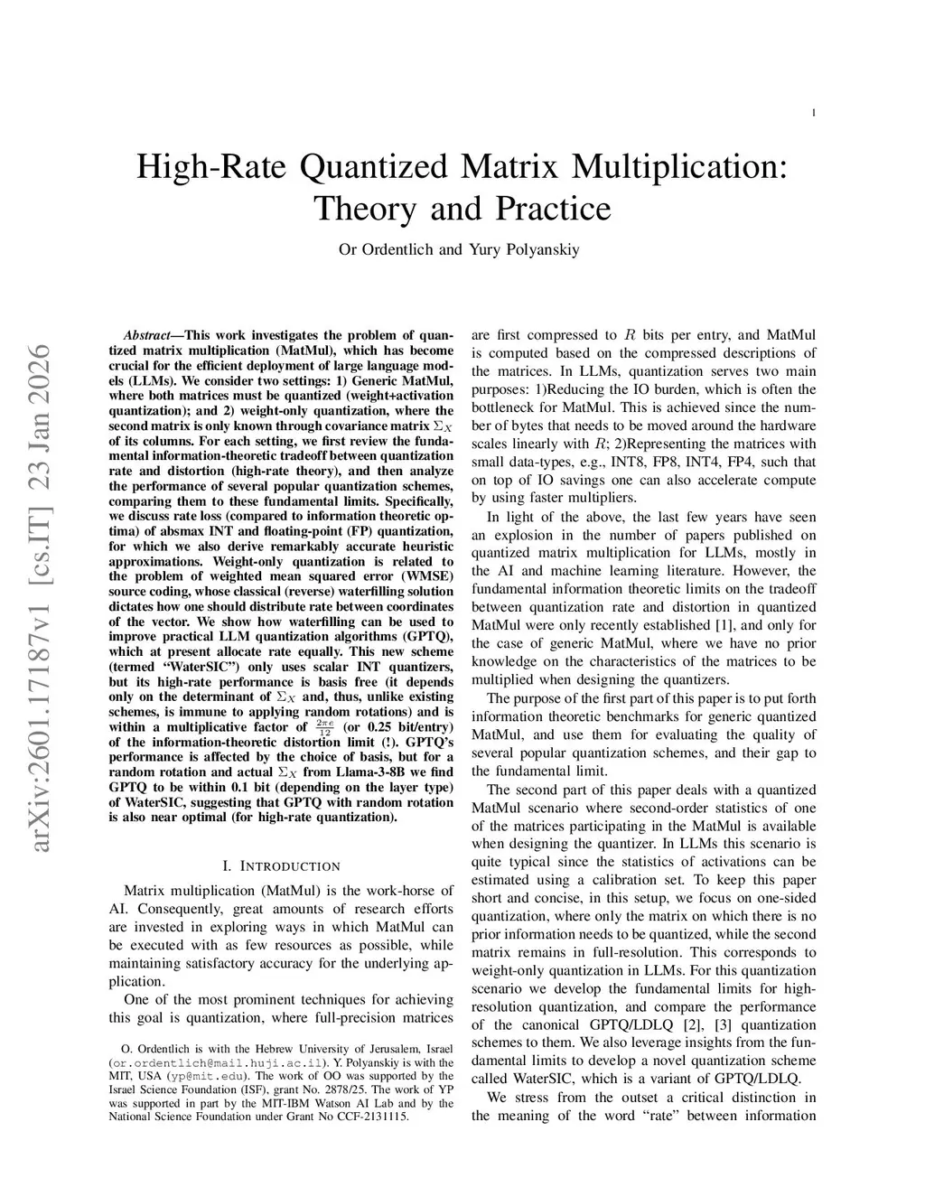 This work investigates the problem of quantized matrix multiplication (MatMul), which has become crucial for the efficient deployment of large language models (LLMs). We consider two settings: 1) Generic MatMul, where both matrices must be quantized (weight+activation quantization); and 2) weight-only quantization, where the second matrix is only known through covariance matrix of its columns. For each setting, we first review the fundamental information-theoretic tradeoff between quantization rate and distortion (high-rate theory), and then analyze the performance of several popular quantization schemes, comparing them to these fundamental limits. Specifically, we discuss rate loss (compared to information theoretic optima) of absmax INT and floating-point (FP) quantization, for which we also derive remarkably accurate heuristic approximations. Weight-only quantization is related to the problem of weighted mean squared error (WMSE) source coding, whose classical (reverse) waterfilling solution dictates how one should distribute rate between coordinates of the vector. We show how waterfilling can be used to improve practical LLM quantization algorithms (GPTQ), which at present allocate rate equally. This new scheme (termed ``WaterSIC'') only uses scalar INT quantizers, but its high-rate performance is basis free (it depends only on the determinant of and, thus, unlike existing schemes, is immune to applying random rotations) and is within a multiplicative factor of (or 0.25 bit/entry) of the information-theoretic distortion limit (!). GPTQ's performance is affected by the choice of basis, but for a random rotation and actual from Llama-3-8B we find GPTQ to be within 0.1 bit (depending on the layer type) of WaterSIC, suggesting that GPTQ with random rotation is also near optimal (for high-rate quantization).