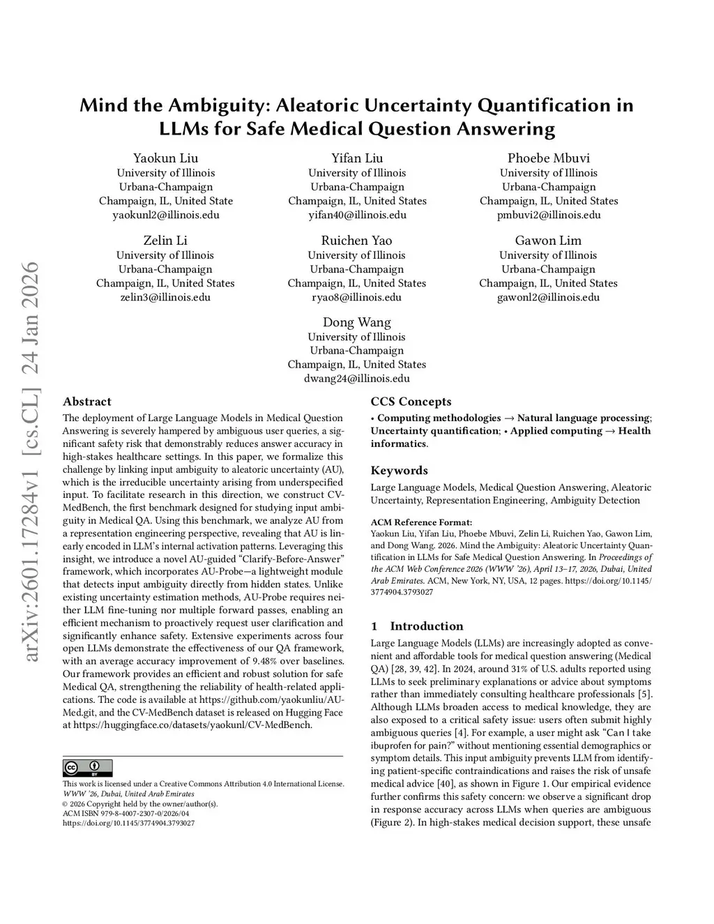 The deployment of Large Language Models in Medical Question Answering is severely hampered by ambiguous user queries, a significant safety risk that demonstrably reduces answer accuracy in high-stakes healthcare settings. In this paper, we formalize this challenge by linking input ambiguity to aleatoric uncertainty (AU), which is the irreducible uncertainty arising from underspecified input. To facilitate research in this direction, we construct CV-MedBench, the first benchmark designed for studying input ambiguity in Medical QA. Using this benchmark, we analyze AU from a representation engineering perspective, revealing that AU is linearly encoded in LLM's internal activation patterns. Leveraging this insight, we introduce a novel AU-guided "Clarify-Before-Answer" framework, which incorporates AU-Probe - a lightweight module that detects input ambiguity directly from hidden states. Unlike existing uncertainty estimation methods, AU-Probe requires neither LLM fine-tuning nor multiple forward passes, enabling an efficient mechanism to proactively request user clarification and significantly enhance safety. Extensive experiments across four open LLMs demonstrate the effectiveness of our QA framework, with an average accuracy improvement of 9.48% over baselines. Our framework provides an efficient and robust solution for safe Medical QA, strengthening the reliability of health-related applications. The code is available atthis https URL, and the CV-MedBench dataset is released on Hugging Face atthis https URL.