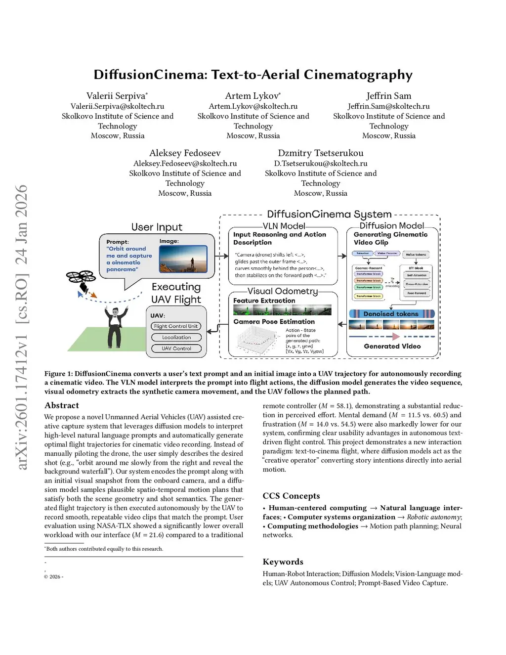 We propose a novel Unmanned Aerial Vehicles (UAV) assisted creative capture system that leverages diffusion models to interpret high-level natural language prompts and automatically generate optimal flight trajectories for cinematic video recording. Instead of manually piloting the drone, the user simply describes the desired shot (e.g., "orbit around me slowly from the right and reveal the background waterfall"). Our system encodes the prompt along with an initial visual snapshot from the onboard camera, and a diffusion model samples plausible spatio-temporal motion plans that satisfy both the scene geometry and shot semantics. The generated flight trajectory is then executed autonomously by the UAV to record smooth, repeatable video clips that match the prompt. User evaluation using NASA-TLX showed a significantly lower overall workload with our interface (M = 21.6) compared to a traditional remote controller (M = 58.1), demonstrating a substantial reduction in perceived effort. Mental demand (M = 11.5 vs. 60.5) and frustration (M = 14.0 vs. 54.5) were also markedly lower for our system, confirming clear usability advantages in autonomous text-driven flight control. This project demonstrates a new interaction paradigm: text-to-cinema flight, where diffusion models act as the "creative operator" converting story intentions directly into aerial motion.