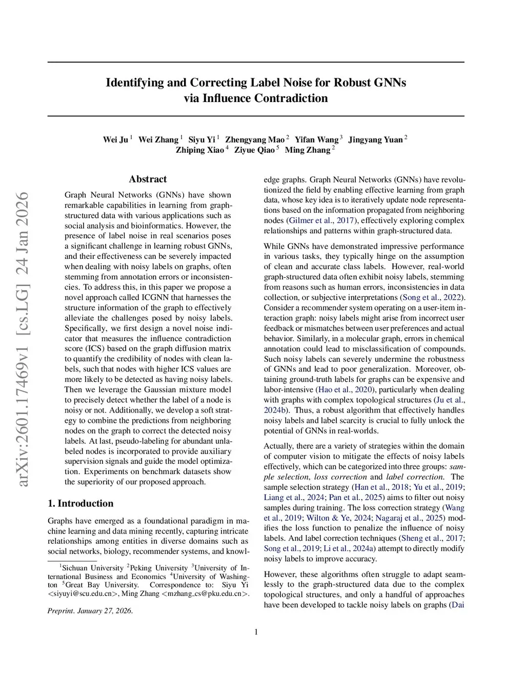 Graph Neural Networks (GNNs) have shown remarkable capabilities in learning from graph-structured data with various applications such as social analysis and bioinformatics. However, the presence of label noise in real scenarios poses a significant challenge in learning robust GNNs, and their effectiveness can be severely impacted when dealing with noisy labels on graphs, often stemming from annotation errors or inconsistencies. To address this, in this paper we propose a novel approach called ICGNN that harnesses the structure information of the graph to effectively alleviate the challenges posed by noisy labels. Specifically, we first design a novel noise indicator that measures the influence contradiction score (ICS) based on the graph diffusion matrix to quantify the credibility of nodes with clean labels, such that nodes with higher ICS values are more likely to be detected as having noisy labels. Then we leverage the Gaussian mixture model to precisely detect whether the label of a node is noisy or not. Additionally, we develop a soft strategy to combine the predictions from neighboring nodes on the graph to correct the detected noisy labels. At last, pseudo-labeling for abundant unlabeled nodes is incorporated to provide auxiliary supervision signals and guide the model optimization. Experiments on benchmark datasets show the superiority of our proposed approach.