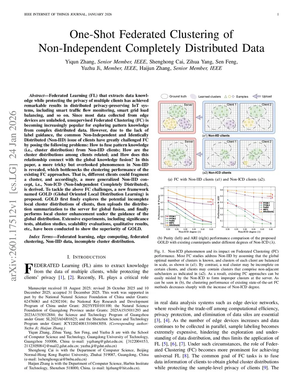 Federated Learning (FL) that extracts data knowledge while protecting the privacy of multiple clients has achieved remarkable results in distributed privacy-preserving IoT systems, including smart traffic flow monitoring, smart grid load balancing, and so on. Since most data collected from edge devices are unlabeled, unsupervised Federated Clustering (FC) is becoming increasingly popular for exploring pattern knowledge from complex distributed data. However, due to the lack of label guidance, the common Non-Independent and Identically Distributed (Non-IID) issue of clients have greatly challenged FC by posing the following problems: How to fuse pattern knowledge (i.e., cluster distribution) from Non-IID clients; How are the cluster distributions among clients related; and How does this relationship connect with the global knowledge fusion? In this paper, a more tricky but overlooked phenomenon in Non-IID is revealed, which bottlenecks the clustering performance of the existing FC approaches. That is, different clients could fragment a cluster, and accordingly, a more generalized Non-IID concept, i.e., Non-ICD (Non-Independent Completely Distributed), is derived. To tackle the above FC challenges, a new framework named GOLD (Global Oriented Local Distribution Learning) is proposed. GOLD first finely explores the potential incomplete local cluster distributions of clients, then uploads the distribution summarization to the server for global fusion, and finally performs local cluster enhancement under the guidance of the global distribution. Extensive experiments, including significance tests, ablation studies, scalability evaluations, qualitative results, etc., have been conducted to show the superiority of GOLD.