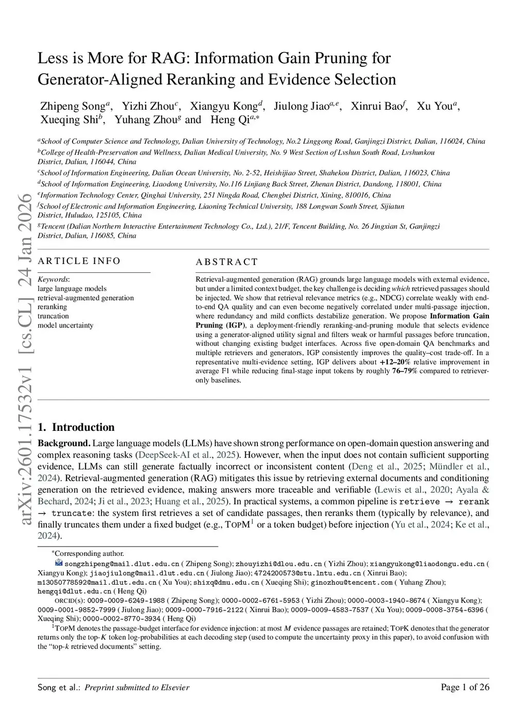 Less is More for RAG: Information Gain Pruning for Generator-Aligned Reranking and Evidence Selection