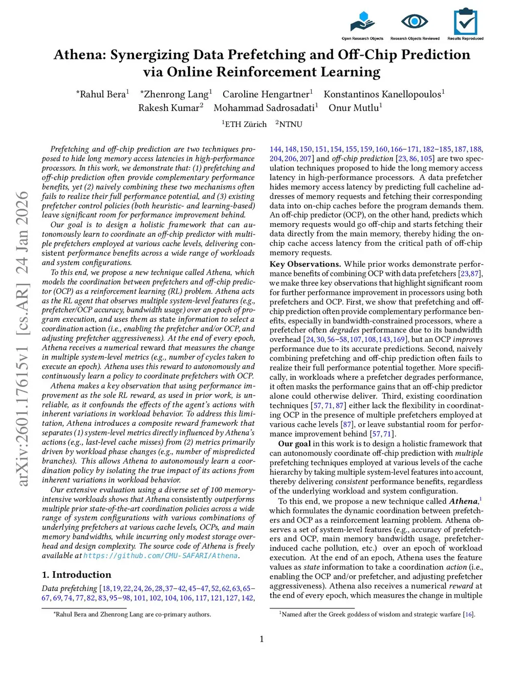 Athena: Synergizing Data Prefetching and Off-Chip Prediction via Online Reinforcement Learning