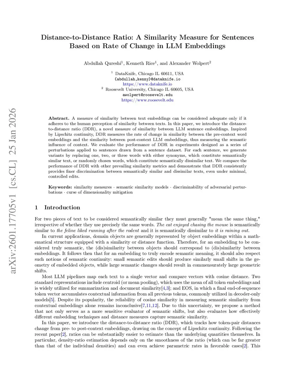 A measure of similarity between text embeddings can be considered adequate only if it adheres to the human perception of similarity between texts. In this paper, we introduce the distance-to-distance ratio (DDR), a novel measure of similarity between LLM sentence embeddings. Inspired by Lipschitz continuity, DDR measures the rate of change in similarity between the pre-context word embeddings and the similarity between post-context LLM embeddings, thus measuring the semantic influence of context. We evaluate the performance of DDR in experiments designed as a series of perturbations applied to sentences drawn from a sentence dataset. For each sentence, we generate variants by replacing one, two, or three words with either synonyms, which constitute semantically similar text, or randomly chosen words, which constitute semantically dissimilar text. We compare the performance of DDR with other prevailing similarity metrics and demonstrate that DDR consistently provides finer discrimination between semantically similar and dissimilar texts, even under minimal, controlled edits.
