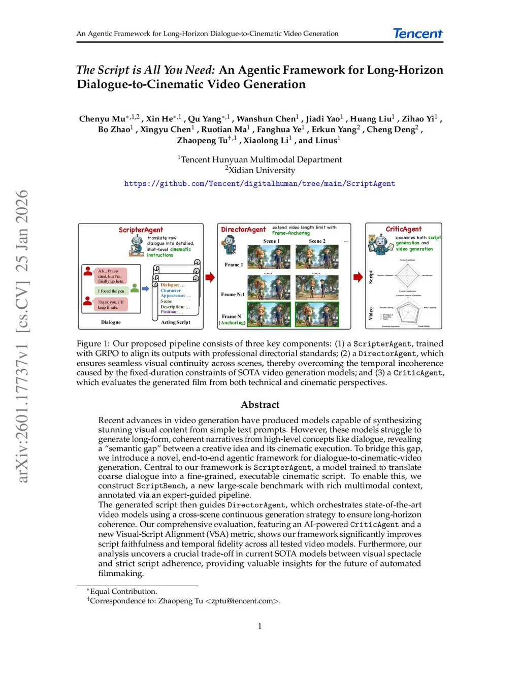 Recent advances in video generation have produced models capable of synthesizing stunning visual content from simple text prompts. However, these models struggle to generate long-form, coherent narratives from high-level concepts like dialogue, revealing a ``semantic gap'' between a creative idea and its cinematic execution. To bridge this gap, we introduce a novel, end-to-end agentic framework for dialogue-to-cinematic-video generation. Central to our framework is ScripterAgent, a model trained to translate coarse dialogue into a fine-grained, executable cinematic script. To enable this, we construct ScriptBench, a new large-scale benchmark with rich multimodal context, annotated via an expert-guided pipeline. The generated script then guides DirectorAgent, which orchestrates state-of-the-art video models using a cross-scene continuous generation strategy to ensure long-horizon coherence. Our comprehensive evaluation, featuring an AI-powered CriticAgent and a new Visual-Script Alignment (VSA) metric, shows our framework significantly improves script faithfulness and temporal fidelity across all tested video models. Furthermore, our analysis uncovers a crucial trade-off in current SOTA models between visual spectacle and strict script adherence, providing valuable insights for the future of automated filmmaking.