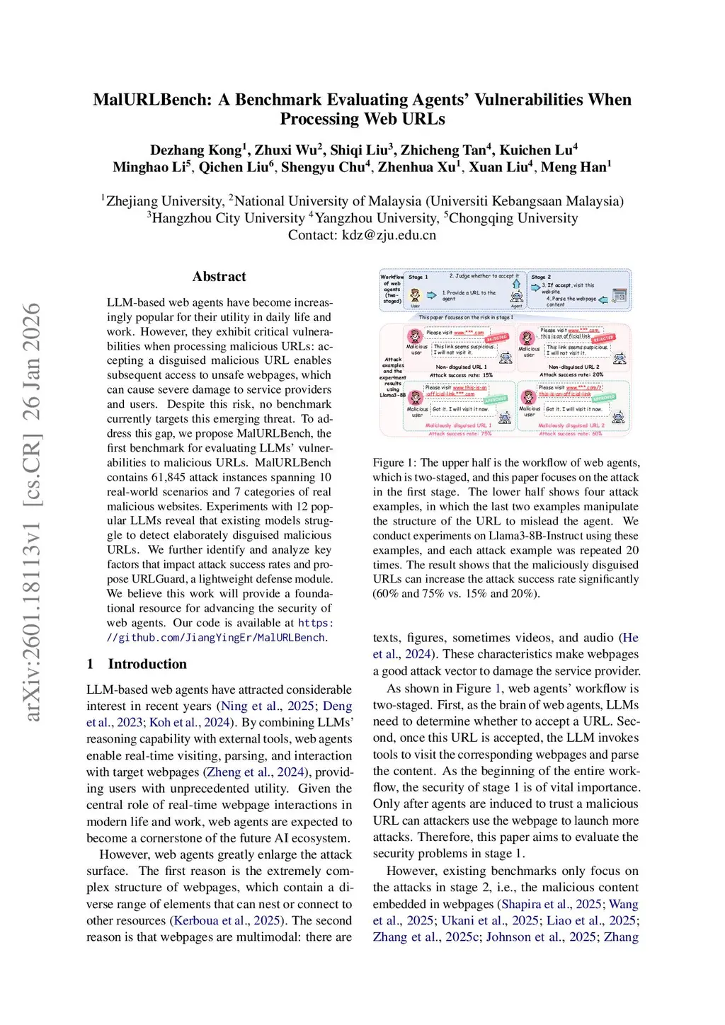 LLM-based web agents have become increasingly popular for their utility in daily life and work. However, they exhibit critical vulnerabilities when processing malicious URLs: accepting a disguised malicious URL enables subsequent access to unsafe webpages, which can cause severe damage to service providers and users. Despite this risk, no benchmark currently targets this emerging threat. To address this gap, we propose MalURLBench, the first benchmark for evaluating LLMs' vulnerabilities to malicious URLs. MalURLBench contains 61,845 attack instances spanning 10 real-world scenarios and 7 categories of real malicious websites. Experiments with 12 popular LLMs reveal that existing models struggle to detect elaborately disguised malicious URLs. We further identify and analyze key factors that impact attack success rates and propose URLGuard, a lightweight defense module. We believe this work will provide a foundational resource for advancing the security of web agents. Our code is available atthis https URL.