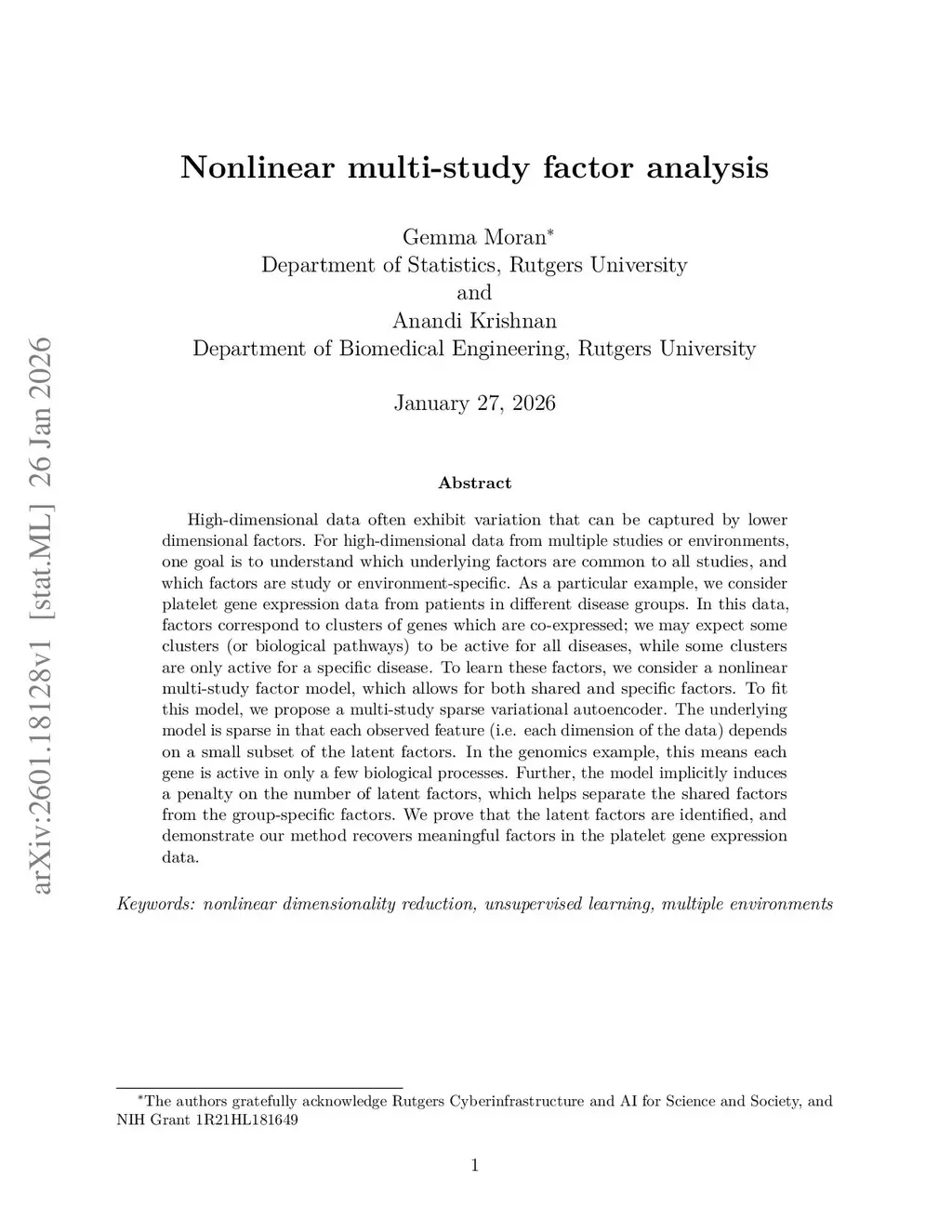 High-dimensional data often exhibit variation that can be captured by lower dimensional factors. For high-dimensional data from multiple studies or environments, one goal is to understand which underlying factors are common to all studies, and which factors are study or environment-specific. As a particular example, we consider platelet gene expression data from patients in different disease groups. In this data, factors correspond to clusters of genes which are co-expressed; we may expect some clusters (or biological pathways) to be active for all diseases, while some clusters are only active for a specific disease. To learn these factors, we consider a nonlinear multi-study factor model, which allows for both shared and specific factors. To fit this model, we propose a multi-study sparse variational autoencoder. The underlying model is sparse in that each observed feature (i.e. each dimension of the data) depends on a small subset of the latent factors. In the genomics example, this means each gene is active in only a few biological processes. Further, the model implicitly induces a penalty on the number of latent factors, which helps separate the shared factors from the group-specific factors. We prove that the latent factors are identified, and demonstrate our method recovers meaningful factors in the platelet gene expression data.
