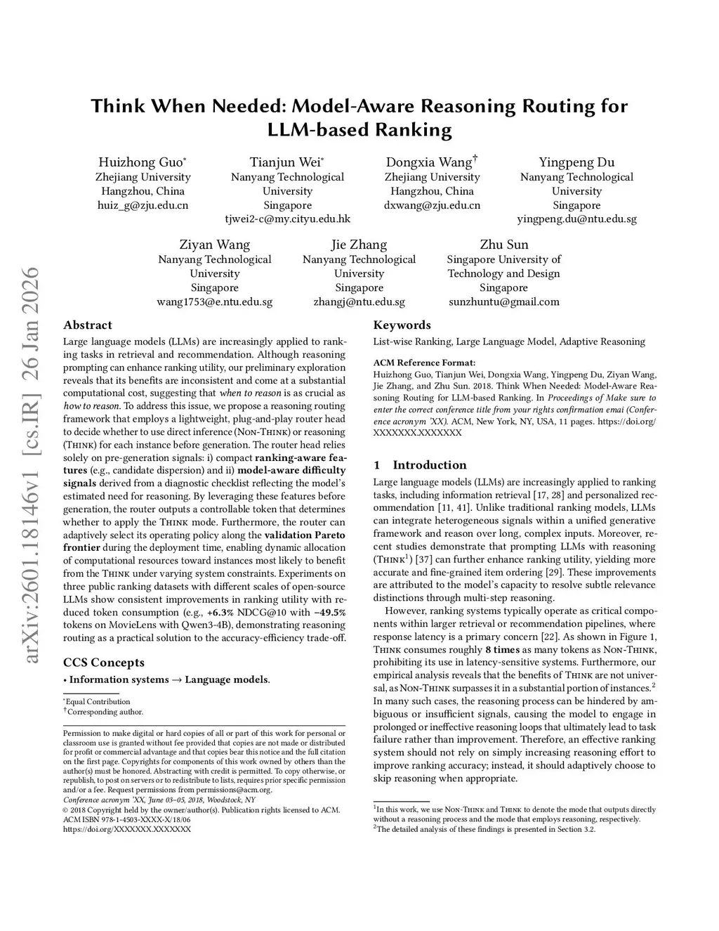 Think When Needed: Model-Aware Reasoning Routing for LLM-based Ranking
