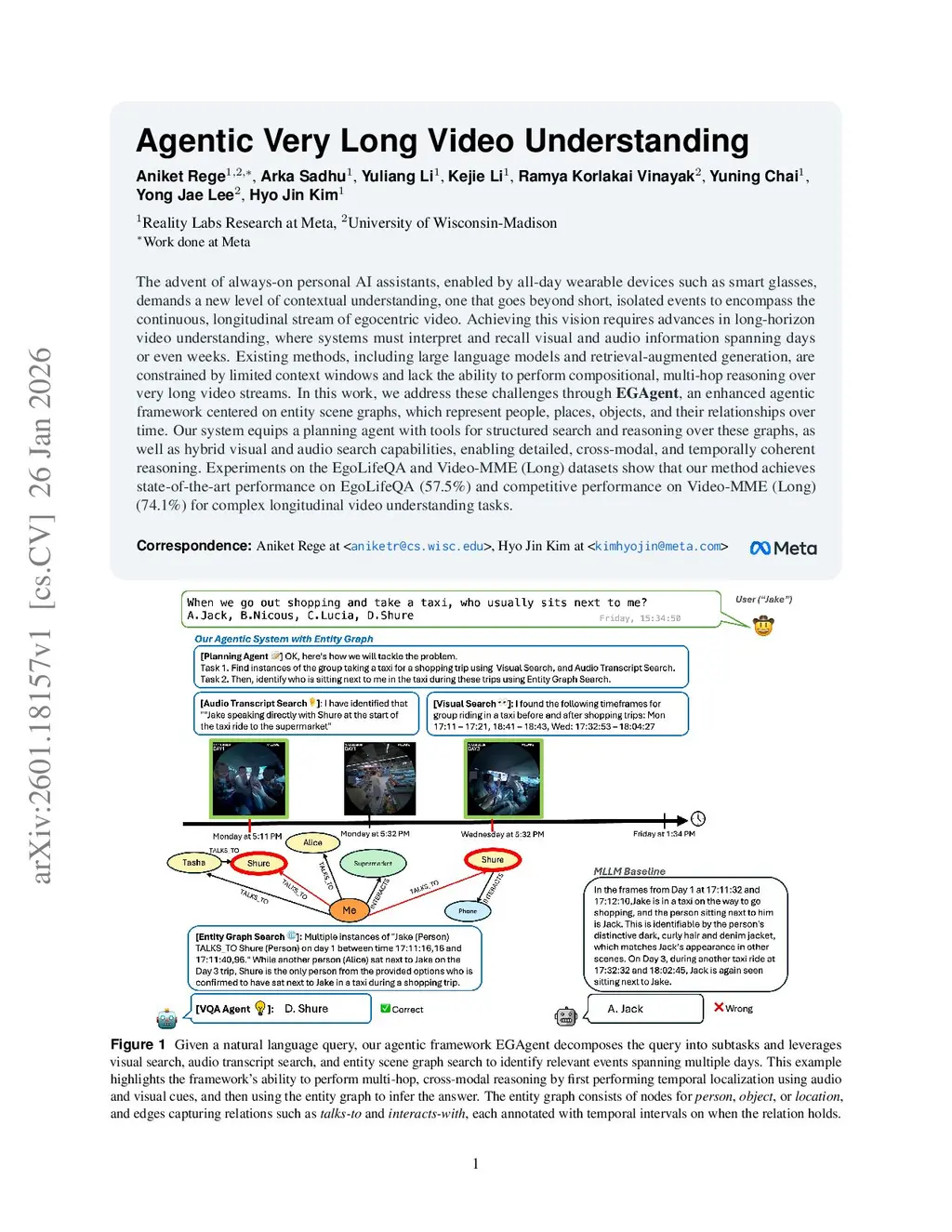 The advent of always-on personal AI assistants, enabled by all-day wearable devices such as smart glasses, demands a new level of contextual understanding, one that goes beyond short, isolated events to encompass the continuous, longitudinal stream of egocentric video. Achieving this vision requires advances in long-horizon video understanding, where systems must interpret and recall visual and audio information spanning days or even weeks. Existing methods, including large language models and retrieval-augmented generation, are constrained by limited context windows and lack the ability to perform compositional, multi-hop reasoning over very long video streams. In this work, we address these challenges through EGAgent, an enhanced agentic framework centered on entity scene graphs, which represent people, places, objects, and their relationships over time. Our system equips a planning agent with tools for structured search and reasoning over these graphs, as well as hybrid visual and audio search capabilities, enabling detailed, cross-modal, and temporally coherent reasoning. Experiments on the EgoLifeQA and Video-MME (Long) datasets show that our method achieves state-of-the-art performance on EgoLifeQA (57.5%) and competitive performance on Video-MME (Long) (74.1%) for complex longitudinal video understanding tasks.