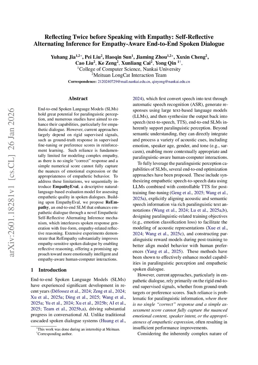 End-to-end Spoken Language Models (SLMs) hold great potential for paralinguistic perception, and numerous studies have aimed to enhance their capabilities, particularly for empathetic dialogue. However, current approaches largely depend on rigid supervised signals, such as ground-truth response in supervised fine-tuning or preference scores in reinforcement learning. Such reliance is fundamentally limited for modeling complex empathy, as there is no single "correct" response and a simple numerical score cannot fully capture the nuances of emotional expression or the appropriateness of empathetic behavior. To address these limitations, we sequentially introduce EmpathyEval, a descriptive natural-language-based evaluation model for assessing empathetic quality in spoken dialogues. Building upon EmpathyEval, we propose ReEmpathy, an end-to-end SLM that enhances empathetic dialogue through a novel Empathetic Self-Reflective Alternating Inference mechanism, which interleaves spoken response generation with free-form, empathy-related reflective reasoning. Extensive experiments demonstrate that ReEmpathy substantially improves empathy-sensitive spoken dialogue by enabling reflective reasoning, offering a promising approach toward more emotionally intelligent and empathy-aware human-computer interactions.