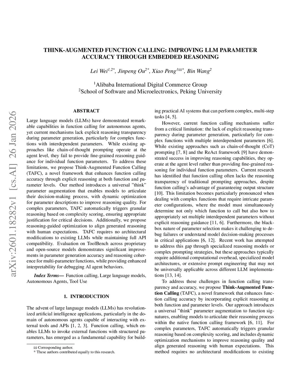 Large language models (LLMs) have demonstrated remarkable capabilities in function calling for autonomous agents, yet current mechanisms lack explicit reasoning transparency during parameter generation, particularly for complex functions with interdependent parameters. While existing approaches like chain-of-thought prompting operate at the agent level, they fail to provide fine-grained reasoning guidance for individual function parameters. To address these limitations, we propose Think-Augmented Function Calling (TAFC), a novel framework that enhances function calling accuracy through explicit reasoning at both function and parameter levels. Our method introduces a universal "think" parameter augmentation that enables models to articulate their decision-making process, with dynamic optimization for parameter descriptions to improve reasoning quality. For complex parameters, TAFC automatically triggers granular reasoning based on complexity scoring, ensuring appropriate justification for critical decisions. Additionally, we propose reasoning-guided optimization to align generated reasoning with human expectations. TAFC requires no architectural modifications to existing LLMs while maintaining full API compatibility. Evaluation on ToolBench across proprietary and open-source models demonstrates significant improvements in parameter generation accuracy and reasoning coherence for multi-parameter functions, while providing enhanced interpretability for debugging AI agent behaviors.