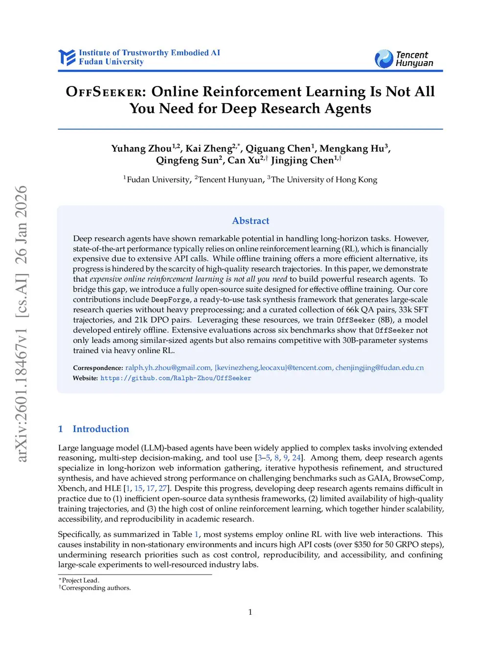 Deep research agents have shown remarkable potential in handling long-horizon tasks. However, state-of-the-art performance typically relies on online reinforcement learning (RL), which is financially expensive due to extensive API calls. While offline training offers a more efficient alternative, its progress is hindered by the scarcity of high-quality research trajectories. In this paper, we demonstrate that expensive online reinforcement learning is not all you need to build powerful research agents. To bridge this gap, we introduce a fully open-source suite designed for effective offline training. Our core contributions include DeepForge, a ready-to-use task synthesis framework that generates large-scale research queries without heavy preprocessing; and a curated collection of 66k QA pairs, 33k SFT trajectories, and 21k DPO pairs. Leveraging these resources, we train OffSeeker (8B), a model developed entirely offline. Extensive evaluations across six benchmarks show that OffSeeker not only leads among similar-sized agents but also remains competitive with 30B-parameter systems trained via heavy online RL.