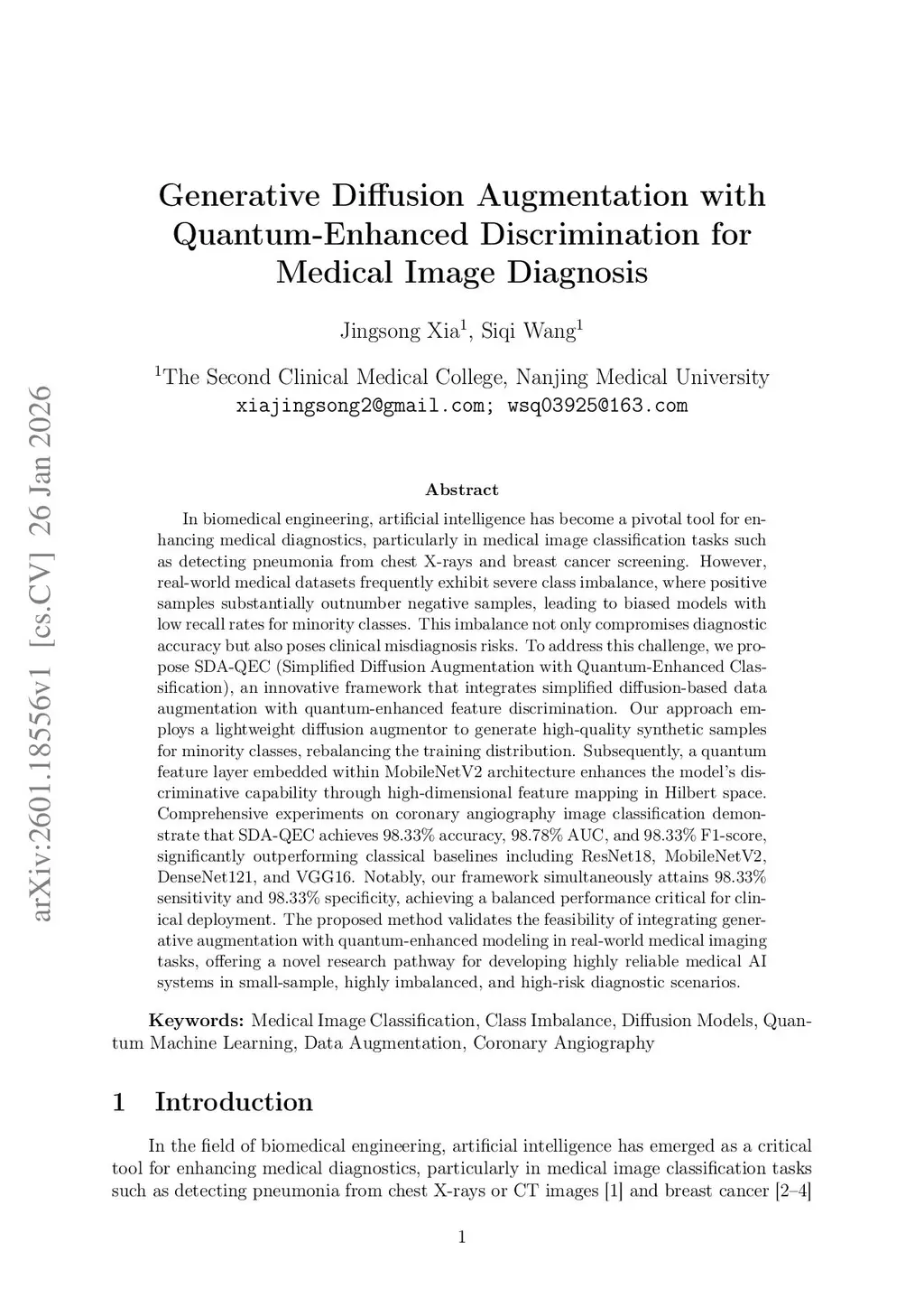 In biomedical engineering, artificial intelligence has become a pivotal tool for enhancing medical diagnostics, particularly in medical image classification tasks such as detecting pneumonia from chest X-rays and breast cancer screening. However, real-world medical datasets frequently exhibit severe class imbalance, where positive samples substantially outnumber negative samples, leading to biased models with low recall rates for minority classes. This imbalance not only compromises diagnostic accuracy but also poses clinical misdiagnosis risks. To address this challenge, we propose SDA-QEC (Simplified Diffusion Augmentation with Quantum-Enhanced Classification), an innovative framework that integrates simplified diffusion-based data augmentation with quantum-enhanced feature discrimination. Our approach employs a lightweight diffusion augmentor to generate high-quality synthetic samples for minority classes, rebalancing the training distribution. Subsequently, a quantum feature layer embedded within MobileNetV2 architecture enhances the model's discriminative capability through high-dimensional feature mapping in Hilbert space. Comprehensive experiments on coronary angiography image classification demonstrate that SDA-QEC achieves 98.33% accuracy, 98.78% AUC, and 98.33% F1-score, significantly outperforming classical baselines including ResNet18, MobileNetV2, DenseNet121, and VGG16. Notably, our framework simultaneously attains 98.33% sensitivity and 98.33% specificity, achieving a balanced performance critical for clinical deployment. The proposed method validates the feasibility of integrating generative augmentation with quantum-enhanced modeling in real-world medical imaging tasks, offering a novel research pathway for developing highly reliable medical AI systems in small-sample, highly imbalanced, and high-risk diagnostic scenarios.