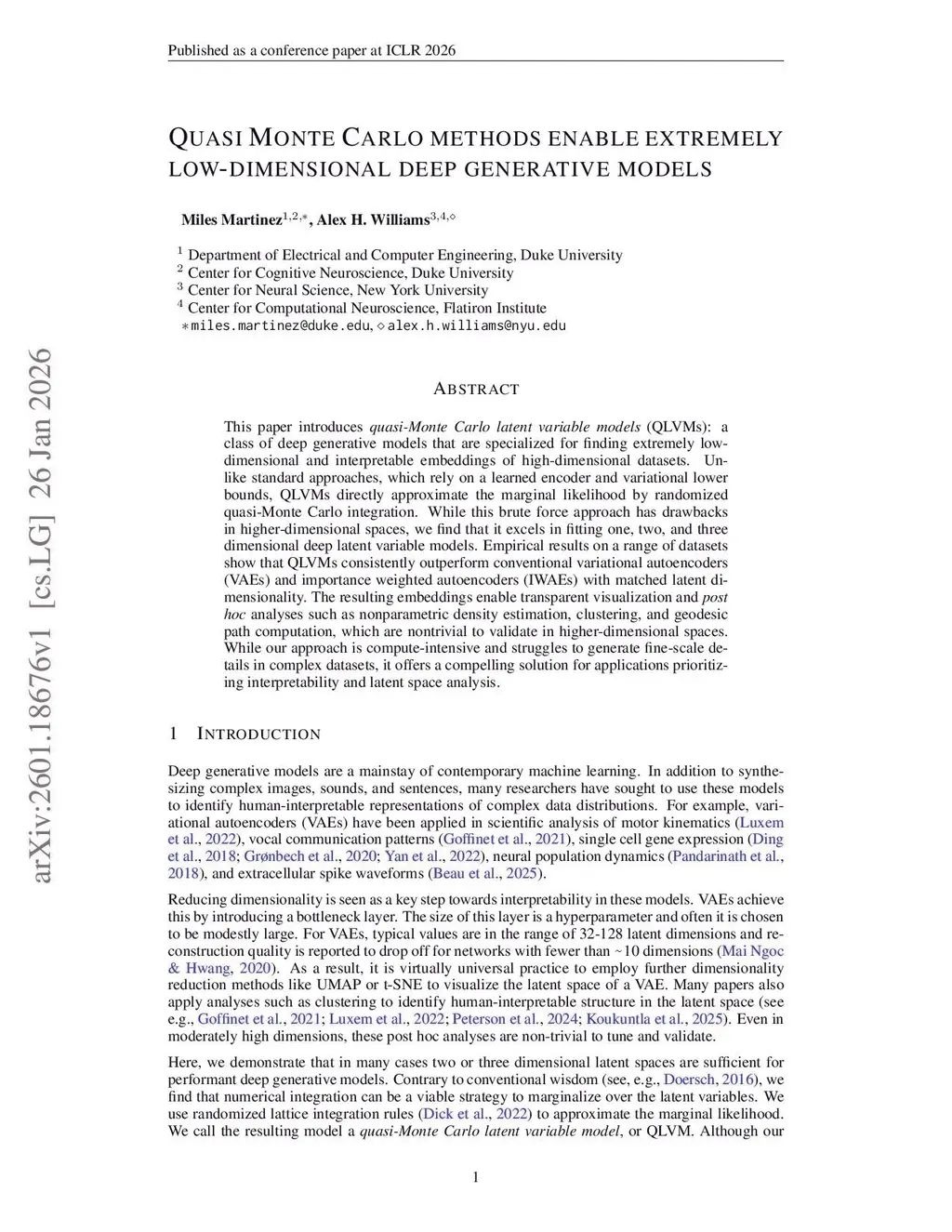 This paper introduces quasi-Monte Carlo latent variable models (QLVMs): a class of deep generative models that are specialized for finding extremely low-dimensional and interpretable embeddings of high-dimensional datasets. Unlike standard approaches, which rely on a learned encoder and variational lower bounds, QLVMs directly approximate the marginal likelihood by randomized quasi-Monte Carlo integration. While this brute force approach has drawbacks in higher-dimensional spaces, we find that it excels in fitting one, two, and three dimensional deep latent variable models. Empirical results on a range of datasets show that QLVMs consistently outperform conventional variational autoencoders (VAEs) and importance weighted autoencoders (IWAEs) with matched latent dimensionality. The resulting embeddings enable transparent visualization and post hoc analyses such as nonparametric density estimation, clustering, and geodesic path computation, which are nontrivial to validate in higher-dimensional spaces. While our approach is compute-intensive and struggles to generate fine-scale details in complex datasets, it offers a compelling solution for applications prioritizing interpretability and latent space analysis.