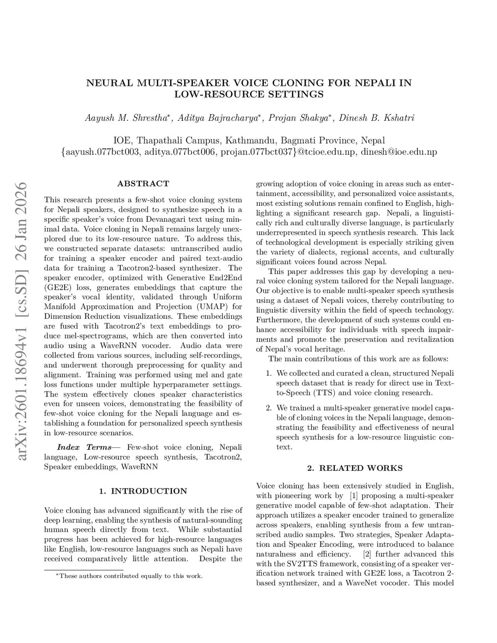 This research presents a few-shot voice cloning system for Nepali speakers, designed to synthesize speech in a specific speaker's voice from Devanagari text using minimal data. Voice cloning in Nepali remains largely unexplored due to its low-resource nature. To address this, we constructed separate datasets: untranscribed audio for training a speaker encoder and paired text-audio data for training a Tacotron2-based synthesizer. The speaker encoder, optimized with Generative End2End loss, generates embeddings that capture the speaker's vocal identity, validated through Uniform Manifold Approximation and Projection (UMAP) for dimension reduction visualizations. These embeddings are fused with Tacotron2's text embeddings to produce mel-spectrograms, which are then converted into audio using a WaveRNN vocoder. Audio data were collected from various sources, including self-recordings, and underwent thorough preprocessing for quality and alignment. Training was performed using mel and gate loss functions under multiple hyperparameter settings. The system effectively clones speaker characteristics even for unseen voices, demonstrating the feasibility of few-shot voice cloning for the Nepali language and establishing a foundation for personalized speech synthesis in low-resource scenarios.