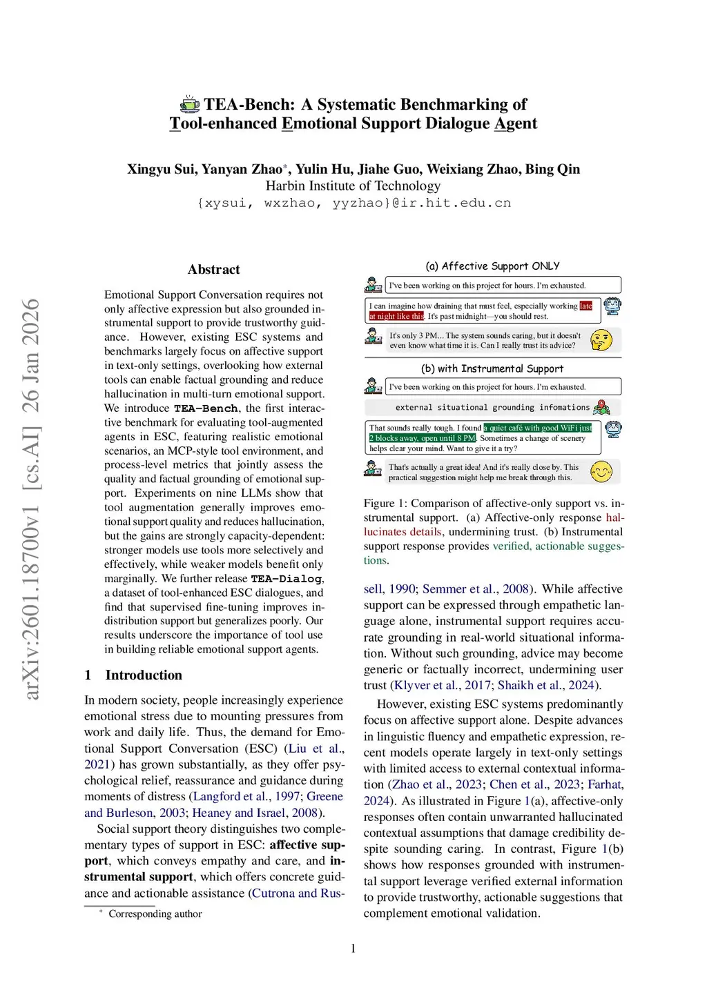 Emotional Support Conversation requires not only affective expression but also grounded instrumental support to provide trustworthy guidance. However, existing ESC systems and benchmarks largely focus on affective support in text-only settings, overlooking how external tools can enable factual grounding and reduce hallucination in multi-turn emotional support. We introduce TEA-Bench, the first interactive benchmark for evaluating tool-augmented agents in ESC, featuring realistic emotional scenarios, an MCP-style tool environment, and process-level metrics that jointly assess the quality and factual grounding of emotional support. Experiments on nine LLMs show that tool augmentation generally improves emotional support quality and reduces hallucination, but the gains are strongly capacity-dependent: stronger models use tools more selectively and effectively, while weaker models benefit only marginally. We further release TEA-Dialog, a dataset of tool-enhanced ESC dialogues, and find that supervised fine-tuning improves in-distribution support but generalizes poorly. Our results underscore the importance of tool use in building reliable emotional support agents.