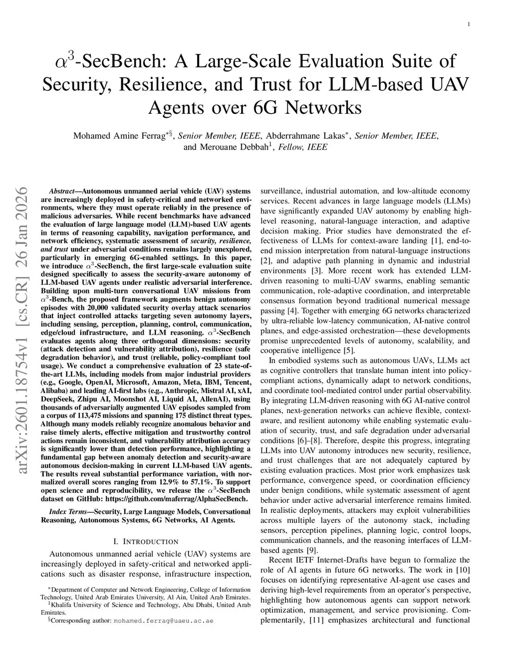 Autonomous unmanned aerial vehicle (UAV) systems are increasingly deployed in safety-critical, networked environments where they must operate reliably in the presence of malicious adversaries. While recent benchmarks have evaluated large language model (LLM)-based UAV agents in reasoning, navigation, and efficiency, systematic assessment of security, resilience, and trust under adversarial conditions remains largely unexplored, particularly in emerging 6G-enabled settings.We introduce -SecBench, the first large-scale evaluation suite for assessing the security-aware autonomy of LLM-based UAV agents under realistic adversarial interference. Building on multi-turn conversational UAV missions from -Bench, the framework augments benign episodes with 20,000 validated security overlay attack scenarios targeting seven autonomy layers, including sensing, perception, planning, control, communication, edge/cloud infrastructure, and LLM reasoning. -SecBench evaluates agents across three orthogonal dimensions: security (attack detection and vulnerability attribution), resilience (safe degradation behavior), and trust (policy-compliant tool usage).We evaluate 23 state-of-the-art LLMs from major industrial providers and leading AI labs using thousands of adversarially augmented UAV episodes sampled from a corpus of 113,475 missions spanning 175 threat types. While many models reliably detect anomalous behavior, effective mitigation, vulnerability attribution, and trustworthy control actions remain inconsistent. Normalized overall scores range from 12.9% to 57.1%, highlighting a significant gap between anomaly detection and security-aware autonomous decision-making. We release -SecBench on GitHub:this https URL